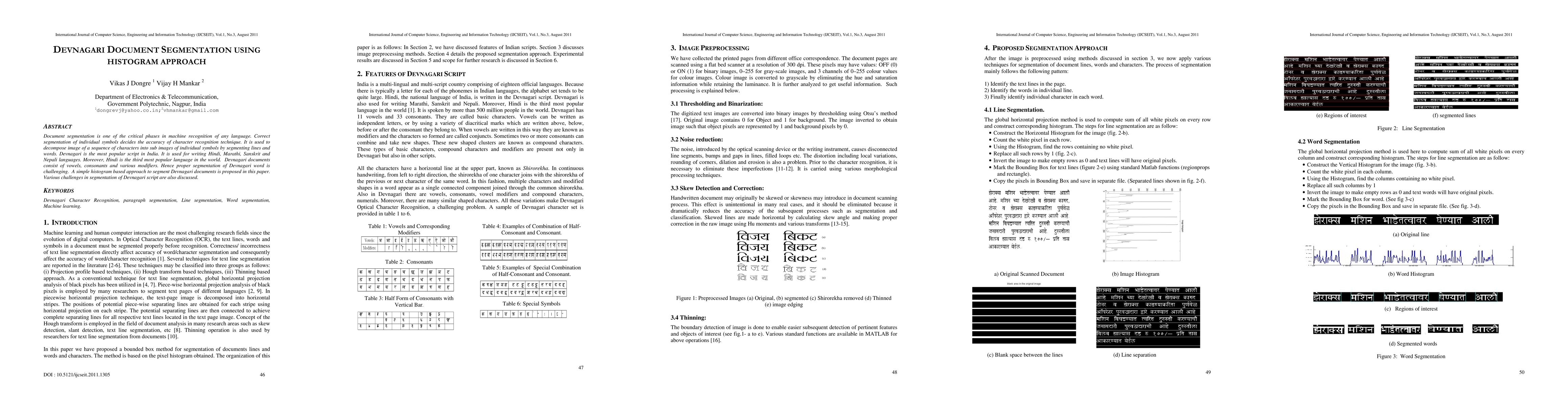 This paper proposes a histogram-based method for segmenting Devnagari documents, addressing the challenge of accurately dividing sequences of characters into individual symbols. It discusses difficulties in Devnagari segmentation and its relevance for recognizing widely-used Indian languages like Hindi, Marathi, Sanskrit, and Nepali.