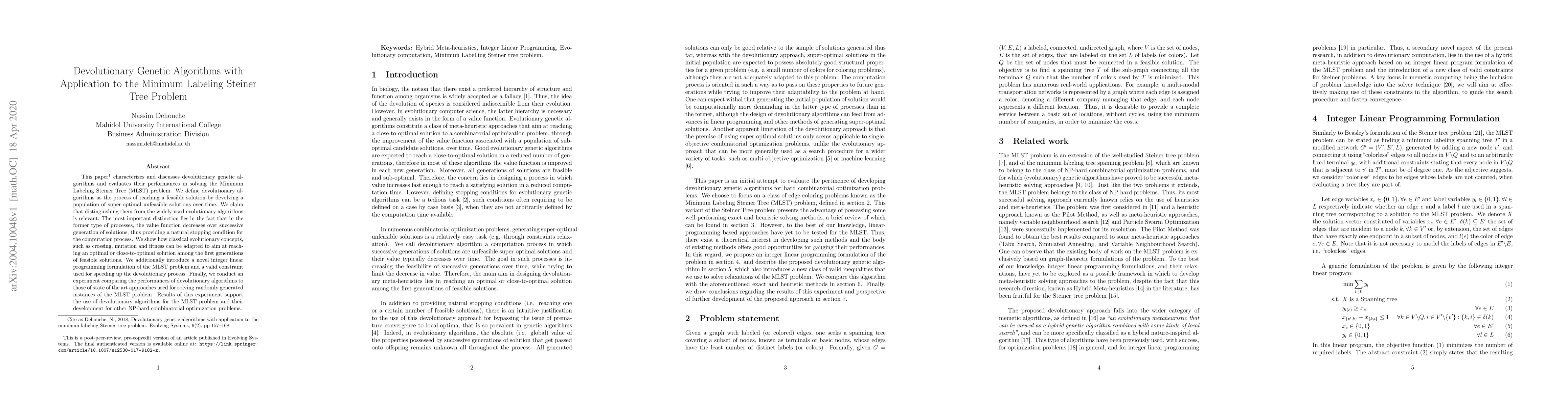 This paper characterizes and discusses devolutionary genetic algorithms and evaluates their performances in solving the minimum labeling Steiner tree (MLST) problem. We define devolutionary algorithms as the process of reaching a feasible solution by devolving a population of super-optimal unfeasible solutions over time. We claim that distinguishing them from the widely used evolutionary algorithms is relevant. The most important distinction lies in the fact that in the former type of processes, the value function decreases over successive generation of solutions, thus providing a natural stopping condition for the computation process. We show how classical evolutionary concepts, such as crossing, mutation and fitness can be adapted to aim at reaching an optimal or close-to-optimal solution among the first generations of feasible solutions. We additionally introduce a novel integer linear programming formulation of the MLST problem and a valid constraint used for speeding up the devolutionary process. Finally, we conduct an experiment comparing the performances of devolutionary algorithms to those of state of the art approaches used for solving randomly generated instances of the MLST problem. Results of this experiment support the use of devolutionary algorithms for the MLST problem and their development for other NP-hard combinatorial optimization problems.