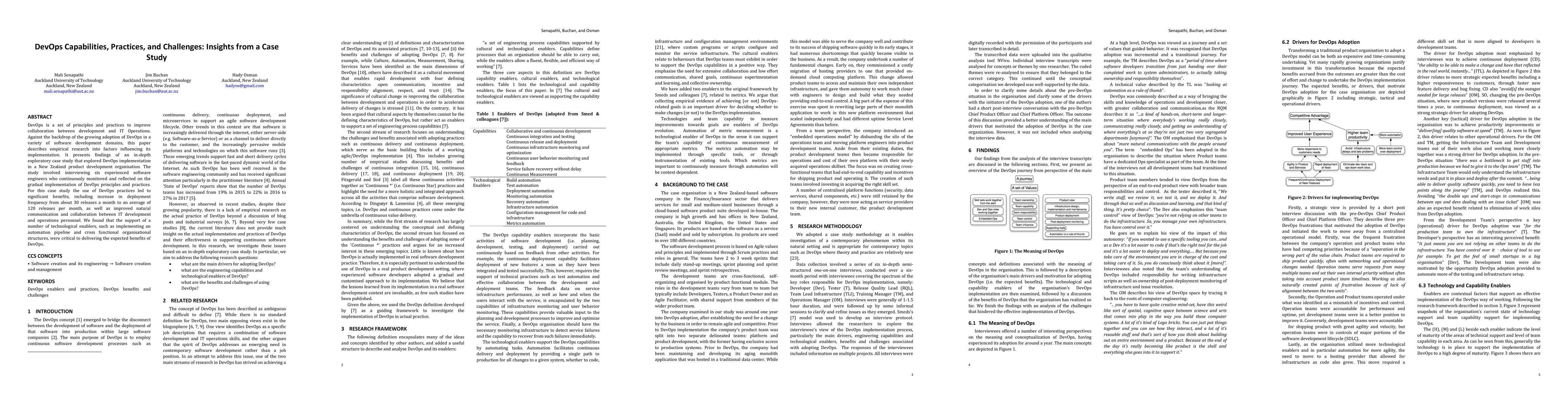This paper explores DevOps implementation through a case study in a New Zealand product development firm, revealing significant benefits such as a tenfold increase in deployment frequency and enhanced communication between development and operations teams. Key enablers included technological automation and cross-functional organizational structures.