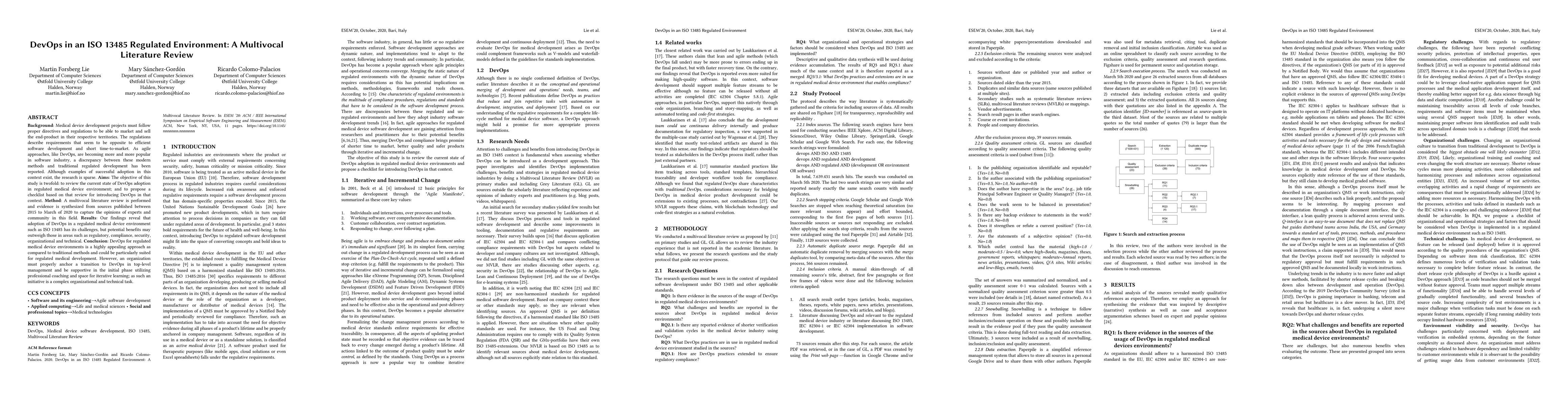 A literature review on DevOps adoption in regulated medical device environments reveals potential benefits, but also challenges that require top-level management support and professional coaching to implement successfully.
