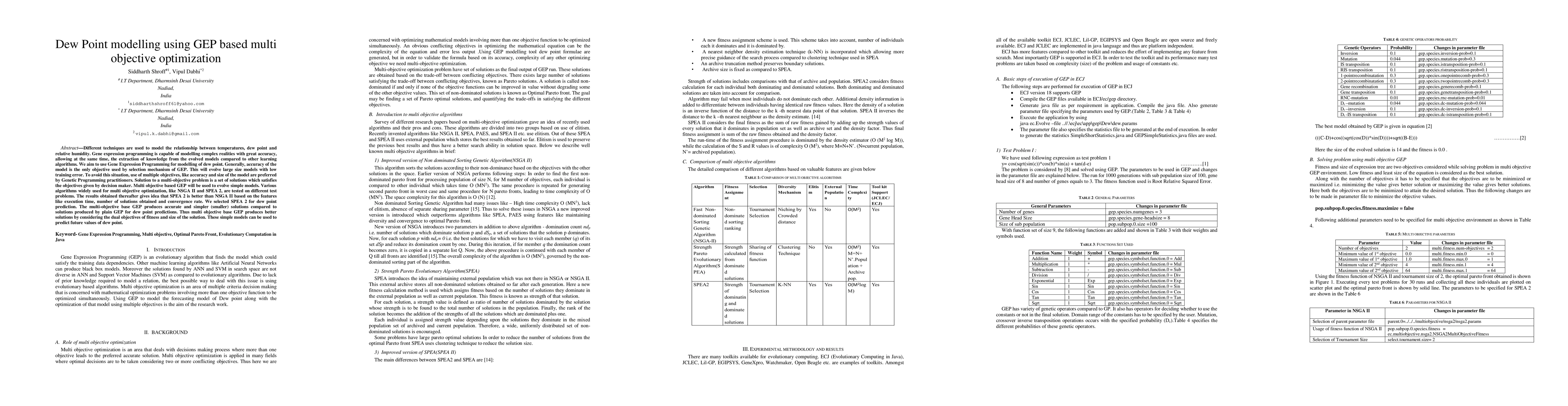 Different techniques are used to model the relationship between temperatures, dew point and relative humidity. Gene expression programming is capable of modelling complex realities with great accuracy, allowing at the same time, the extraction of knowledge from the evolved models compared to other learning algorithms. We aim to use Gene Expression Programming for modelling of dew point. Generally, accuracy of the model is the only objective used by selection mechanism of GEP. This will evolve large size models with low training error. To avoid this situation, use of multiple objectives, like accuracy and size of the model are preferred by Genetic Programming practitioners. Solution to a multi-objective problem is a set of solutions which satisfies the objectives given by decision maker. Multi objective based GEP will be used to evolve simple models. Various algorithms widely used for multi objective optimization, like NSGA II and SPEA 2, are tested on different test problems. The results obtained thereafter gives idea that SPEA 2 is better than NSGA II based on the features like execution time, number of solutions obtained and convergence rate. We selected SPEA 2 for dew point prediction. The multi-objective base GEP produces accurate and simpler (smaller) solutions compared to solutions produced by plain GEP for dew point predictions. Thus multi objective base GEP produces better solutions by considering the dual objectives of fitness and size of the solution. These simple models can be used to predict future values of dew point.