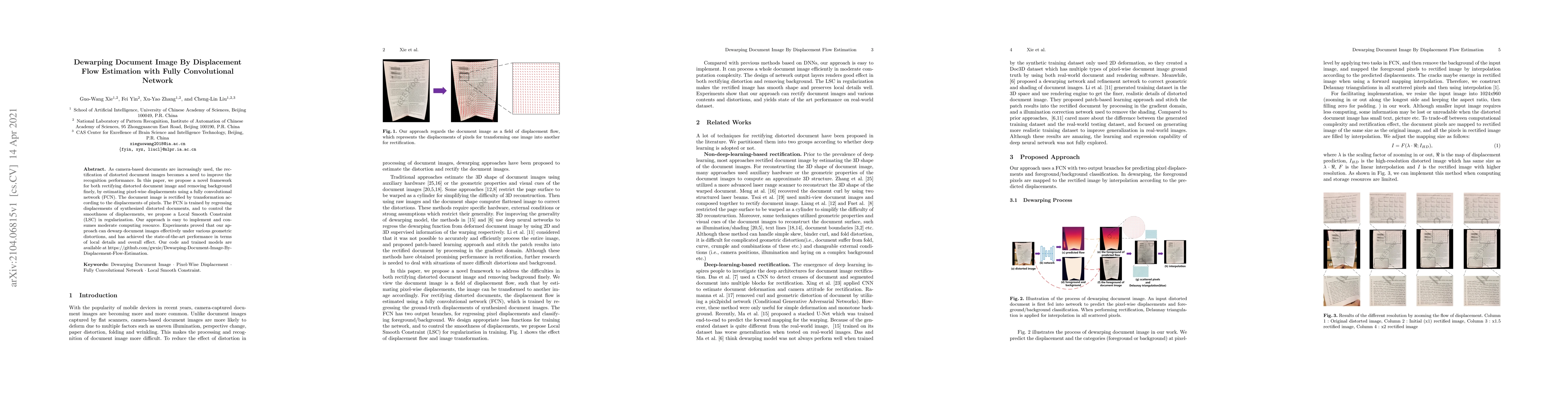 As camera-based documents are increasingly used, the rectification of distorted document images becomes a need to improve the recognition performance. In this paper, we propose a novel framework for both rectifying distorted document image and removing background finely, by estimating pixel-wise displacements using a fully convolutional network (FCN). The document image is rectified by transformation according to the displacements of pixels. The FCN is trained by regressing displacements of synthesized distorted documents, and to control the smoothness of displacements, we propose a Local Smooth Constraint (LSC) in regularization. Our approach is easy to implement and consumes moderate computing resource. Experiments proved that our approach can dewarp document images effectively under various geometric distortions, and has achieved the state-of-the-art performance in terms of local details and overall effect.