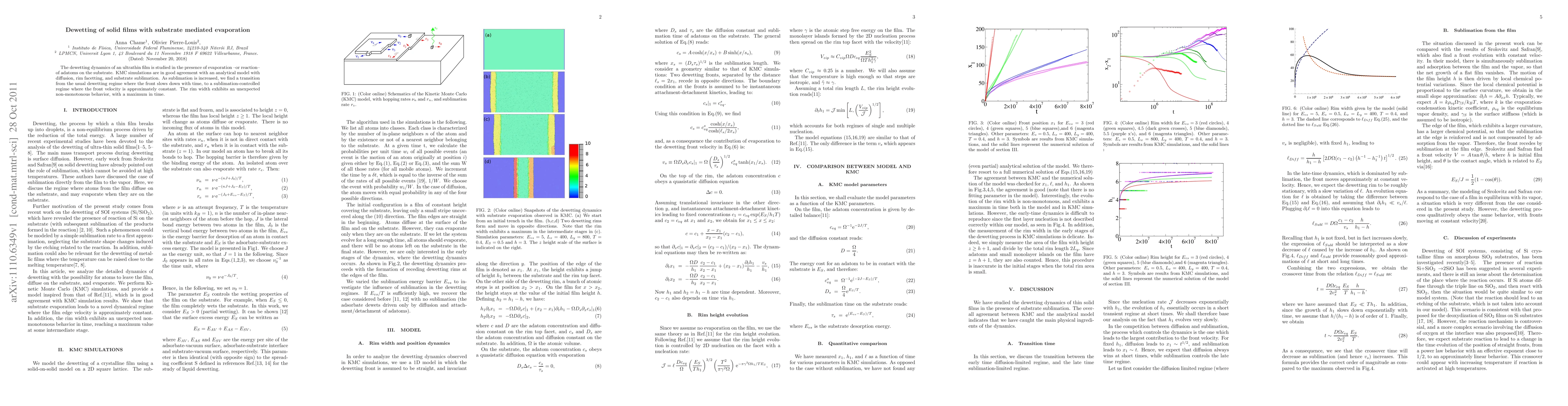 This paper investigates the dewetting dynamics of ultrathin films under substrate-mediated evaporation, showing a transition from time-dependent to constant front velocity regimes as sublimation increases. KMC simulations align with an analytical model, revealing a non-monotonic rim width behavior with a maximum over time.