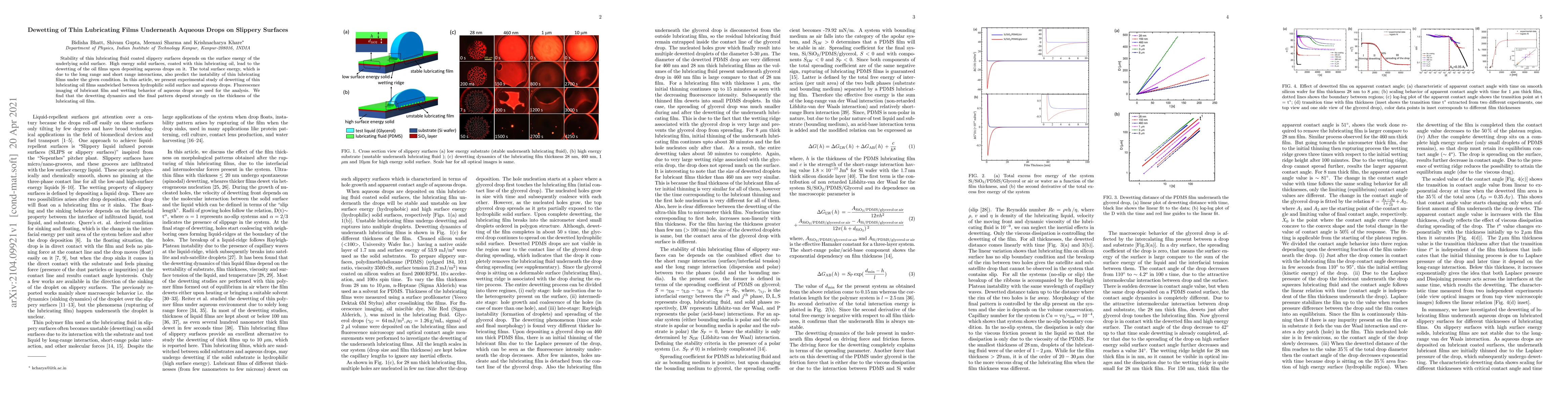 The paper presents an experimental study on dewetting dynamics of thin lubricating films under aqueous drops on slippery surfaces, highlighting the significant influence of lubricant film thickness on the dewetting process.