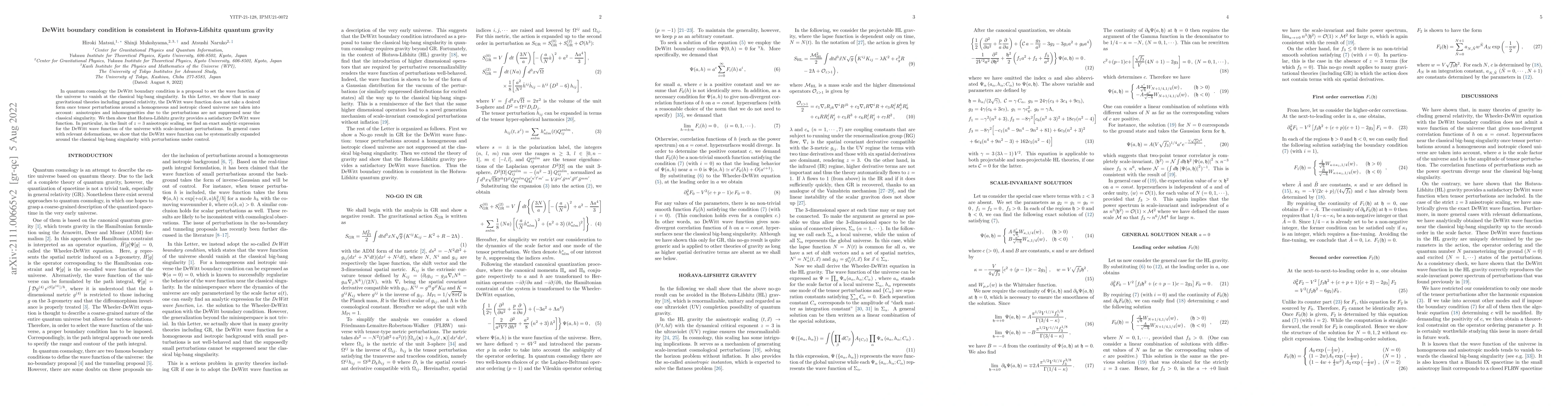 In quantum cosmology the DeWitt boundary condition is a proposal to set the wave function of the universe to vanish at the classical big-bang singularity. In this Letter, we show that in many gravitational theories including general relativity, the DeWitt wave function does not take a desired form once tensor perturbations around a homogeneous and isotropic closed universe are taken into account: anisotropies and inhomogeneities due to the perturbations are not suppressed near the classical singularity. We then show that Ho\v{r}ava-Lifshitz gravity provides a satisfactory DeWitt wave function. In particular, in the limit of $z=3$ anisotropic scaling, we find an exact analytic expression for the DeWitt wave function of the universe with scale-invariant perturbations. In general cases with relevant deformations, we show that the DeWitt wave function can be systematically expanded around the classical big-bang singularity with perturbations under control.
