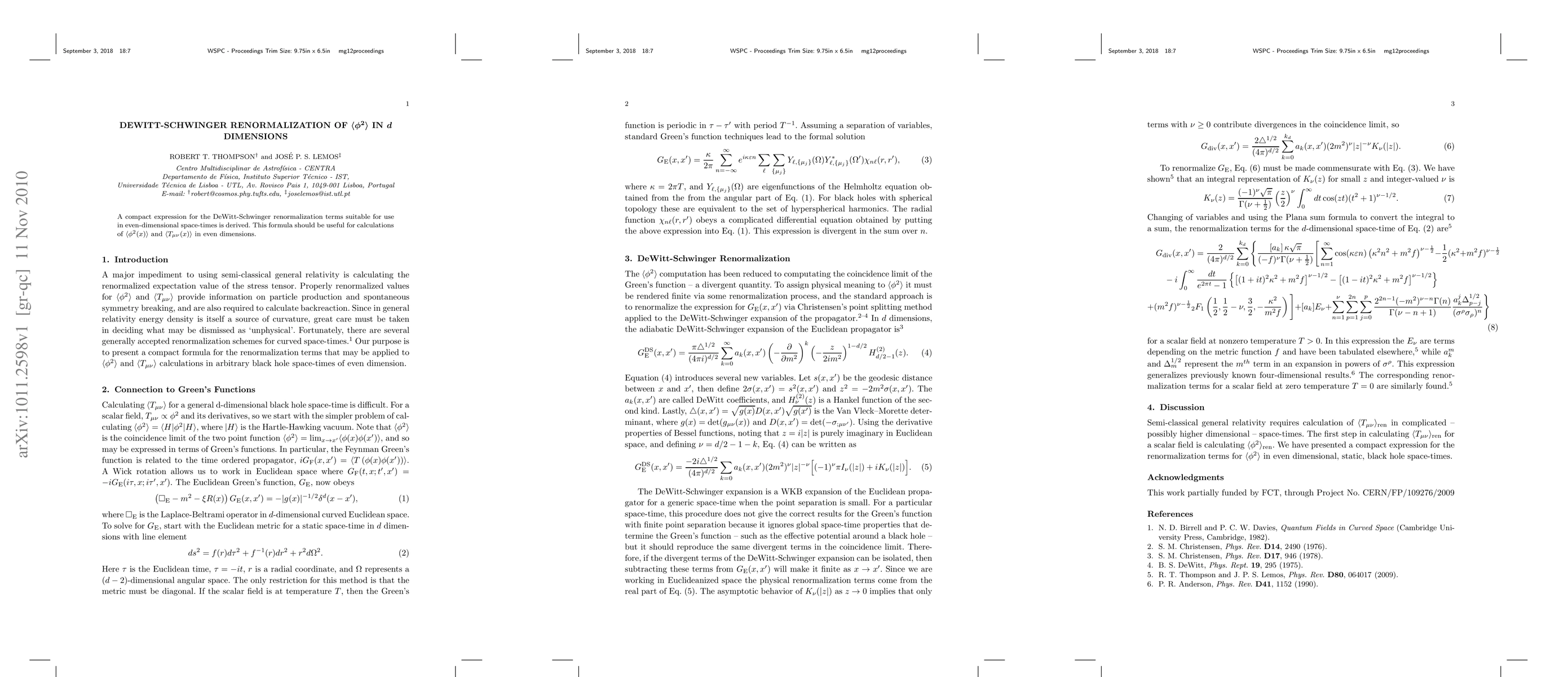 This paper derives a concise formula for DeWitt-Schwinger renormalization terms applicable in even-dimensional space-times, facilitating calculations of $<\phi^2(x)>$ and $<T_{\mu\nu}(x)>$ in such dimensions.