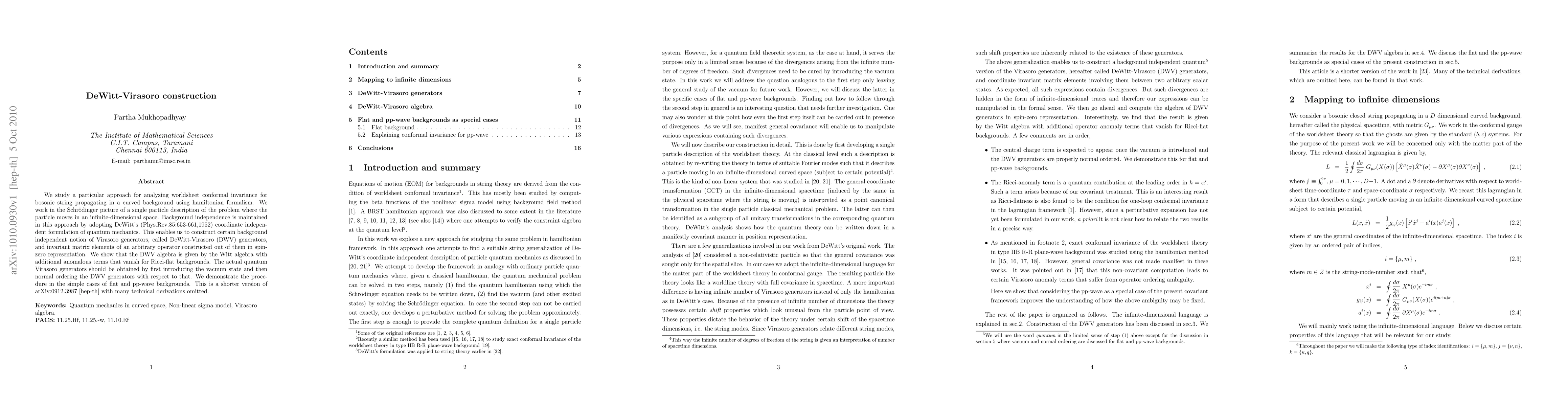 We study a particular approach for analyzing worldsheet conformal invariance for bosonic string propagating in a curved background using hamiltonian formalism. We work in the Schrodinger picture of a single particle description of the problem where the particle moves in an infinite-dimensional space. Background independence is maintained in this approach by adopting DeWitt's (Phys.Rev.85:653-661,1952) coordinate independent formulation of quantum mechanics. This enables us to construct certain background independent notion of Virasoro generators, called DeWitt-Virasoro (DWV) generators, and invariant matrix elements of an arbitrary operator constructed out of them in spin-zero representation. We show that the DWV algebra is given by the Witt algebra with additional anomalous terms that vanish for Ricci-flat backgrounds. The actual quantum Virasoro generators should be obtained by first introducing the vacuum state and then normal ordering the DWV generators with respect to that. We demonstrate the procedure in the simple cases of flat and pp-wave backgrounds. This is a shorter version of arXiv:0912.3987 [hep-th] with many technical derivations omitted.