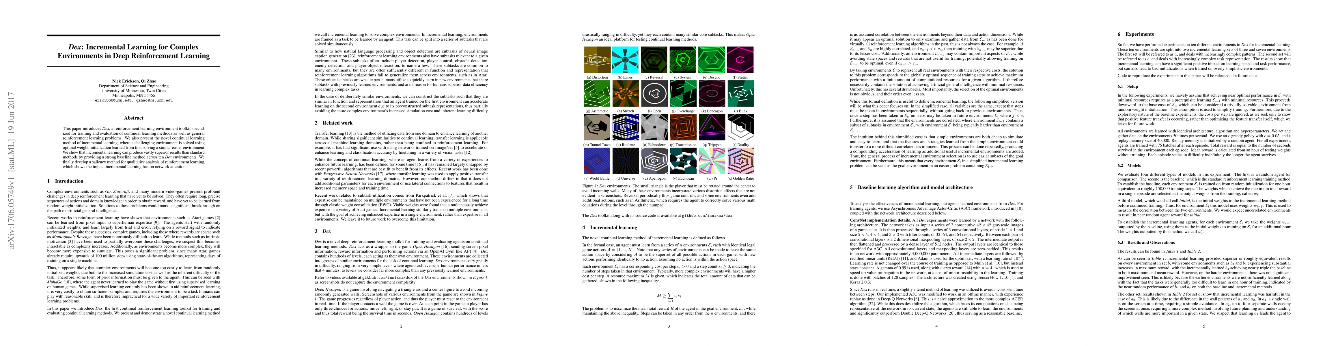 This paper introduces Dex, a reinforcement learning environment toolkit for continual learning and general RL problems, and presents an incremental learning method that leverages optimal weight initialization from easier environments to solve complex ones. The study demonstrates superior performance of incremental learning over standard methods and includes a saliency method for qualitative analysis of network attention.
