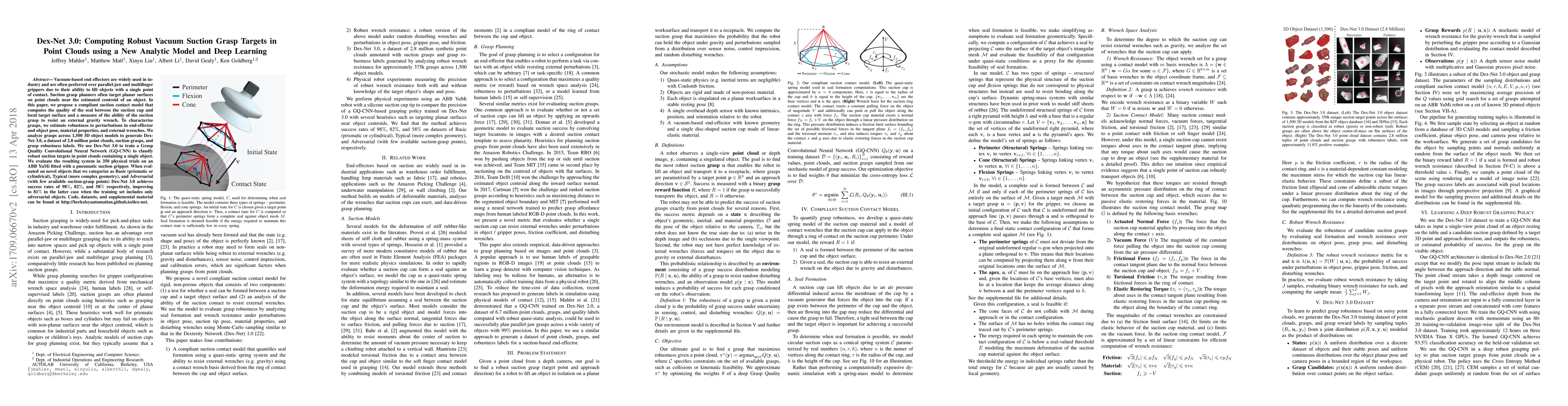 This paper introduces Dex-Net 3.0, a dataset for robust suction grasp targets in point clouds, and a GQ-CNN trained on it to classify robust suction grasps. The system achieves high success rates on basic, typical, and adversarial objects, demonstrating improved performance on challenging cases when trained with adversarial data.