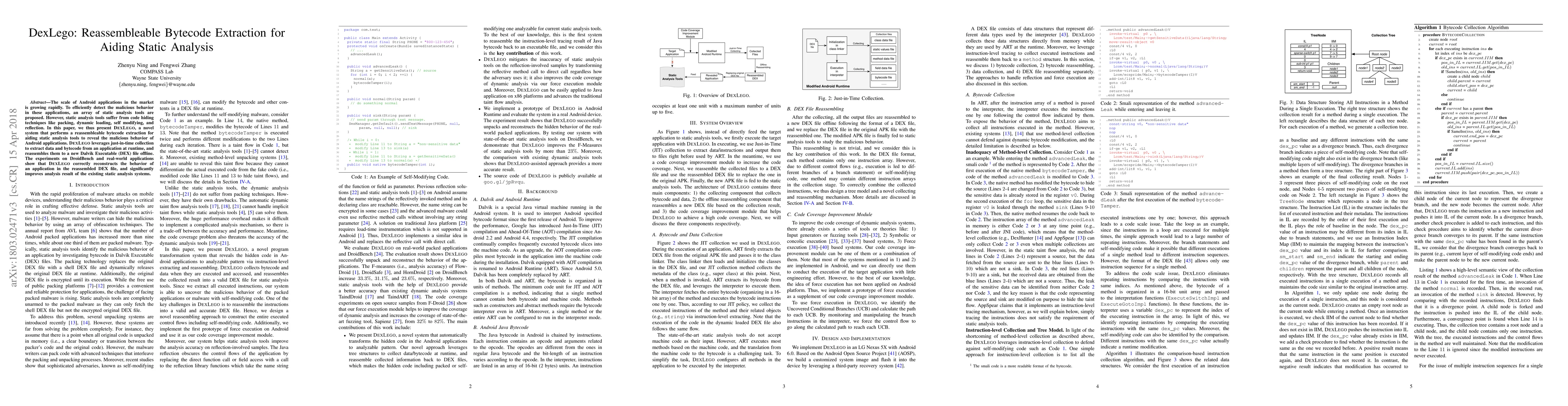 DexLego is a system designed to extract and reassemble bytecode from Android applications to aid static analysis, overcoming code hiding techniques. It collects data and bytecode at runtime and reconstructs them into a new Dalvik Executable (DEX) file, significantly enhancing the effectiveness of existing static analysis tools.