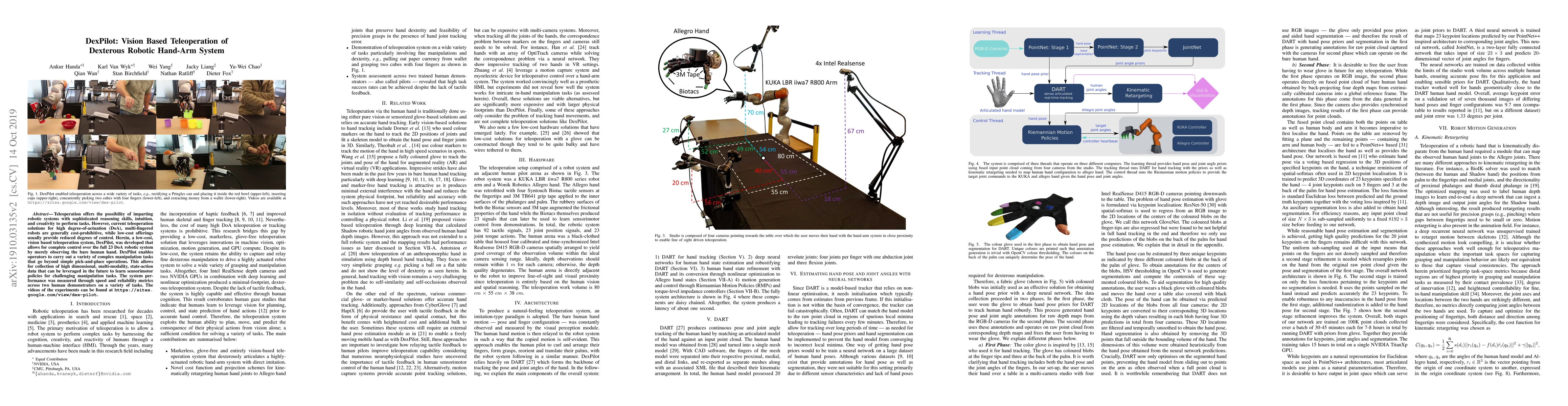 DexPilot is a low-cost, vision-based teleoperation system that enables complete control of a 23-DoA robotic hand-arm system by observing human hand movements. It allows for complex manipulation tasks and collects high-dimensional data for future sensorimotor policy learning.