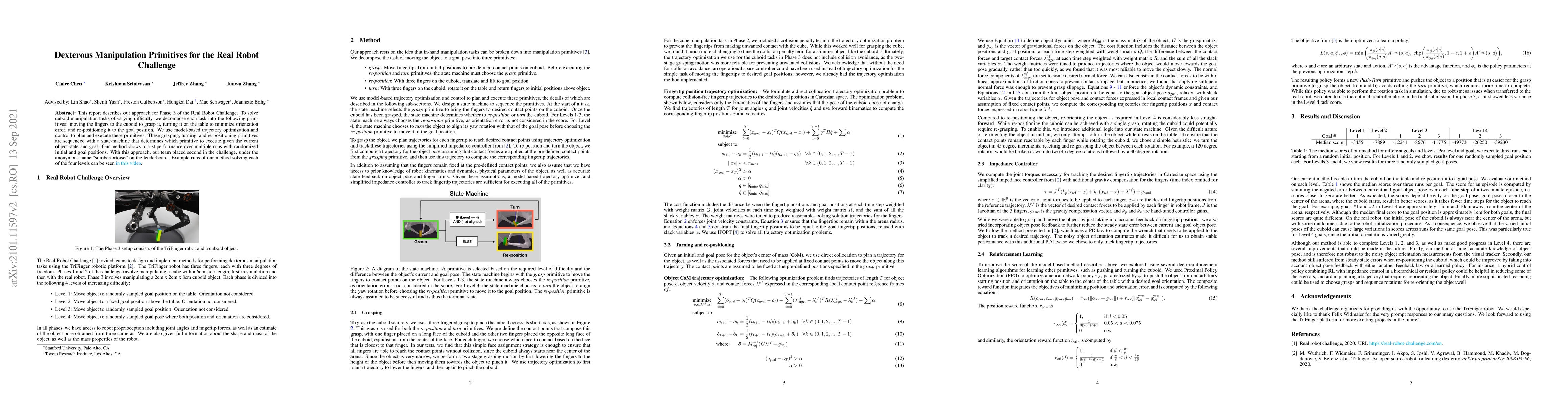 This report describes our approach for Phase 3 of the Real Robot Challenge. To solve cuboid manipulation tasks of varying difficulty, we decompose each task into the following primitives: moving the fingers to the cuboid to grasp it, turning it on the table to minimize orientation error, and re-positioning it to the goal position. We use model-based trajectory optimization and control to plan and execute these primitives. These grasping, turning, and re-positioning primitives are sequenced with a state-machine that determines which primitive to execute given the current object state and goal. Our method shows robust performance over multiple runs with randomized initial and goal positions. With this approach, our team placed second in the challenge, under the anonymous name "sombertortoise" on the leaderboard. Example runs of our method solving each of the four levels can be seen in this video (https://www.youtube.com/watch?v=I65Kwu9PGmg&list=PLt9QxrtaftrHGXcp4Oh8-s_OnQnBnLtei&index=1).
