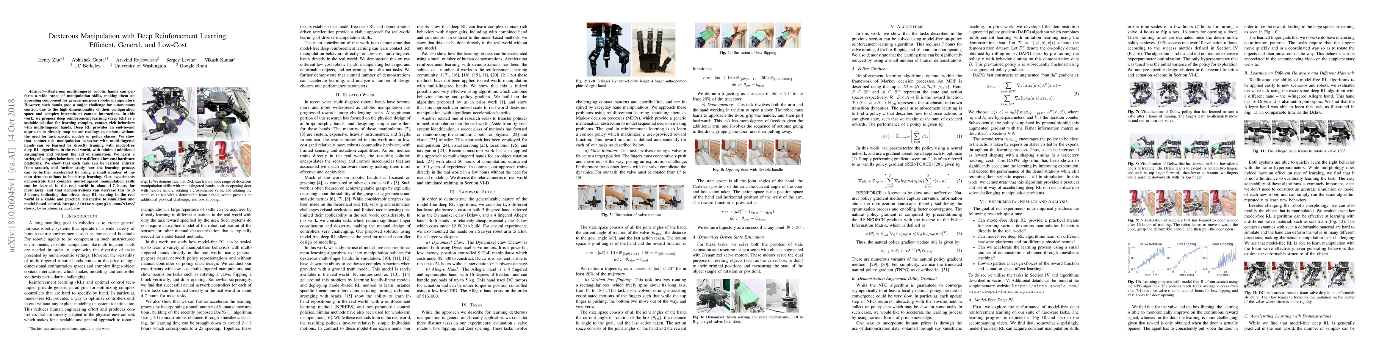 The paper presents a novel approach for learning dexterous manipulation tasks using deep RL, demonstrating its effectiveness on real hardware without extensive simulation or manual engineering.