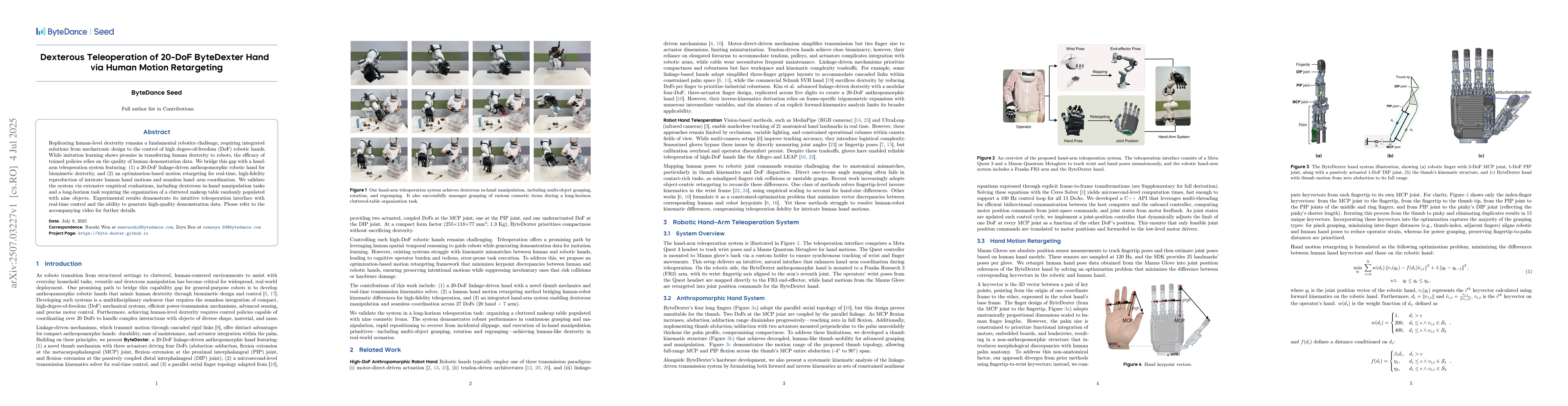 Replicating human--level dexterity remains a fundamental robotics challenge, requiring integrated solutions from mechatronic design to the control of high degree--of--freedom (DoF) robotic hands. While imitation learning shows promise in transferring human dexterity to robots, the efficacy of trained policies relies on the quality of human demonstration data. We bridge this gap with a hand--arm teleoperation system featuring: (1) a 20--DoF linkage--driven anthropomorphic robotic hand for biomimetic dexterity, and (2) an optimization--based motion retargeting for real--time, high--fidelity reproduction of intricate human hand motions and seamless hand--arm coordination. We validate the system via extensive empirical evaluations, including dexterous in-hand manipulation tasks and a long--horizon task requiring the organization of a cluttered makeup table randomly populated with nine objects. Experimental results demonstrate its intuitive teleoperation interface with real--time control and the ability to generate high--quality demonstration data. Please refer to the accompanying video for further details.
