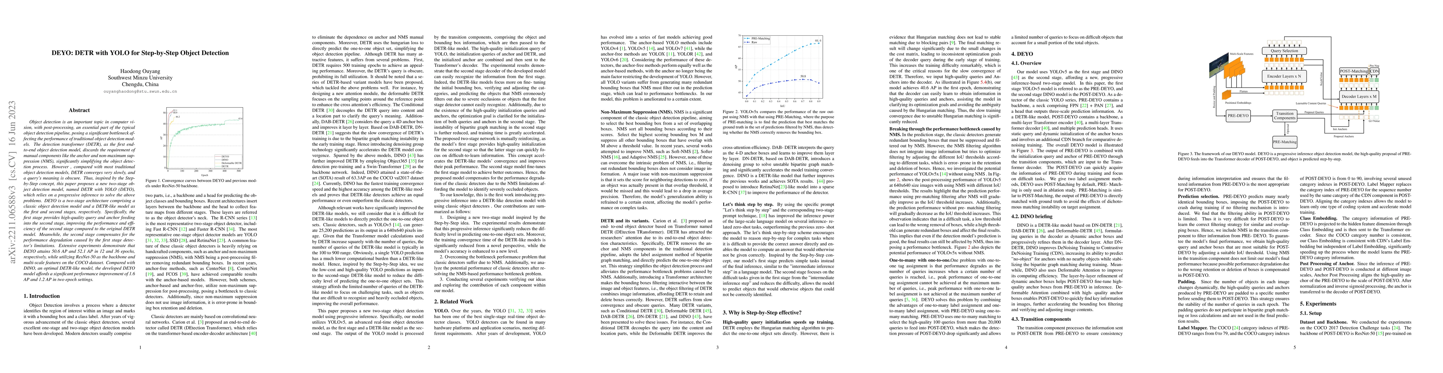 Object detection is an important topic in computer vision, with post-processing, an essential part of the typical object detection pipeline, posing a significant bottleneck affecting the performance of traditional object detection models. The detection transformer (DETR), as the first end-to-end target detection model, discards the requirement of manual components like the anchor and non-maximum suppression (NMS), significantly simplifying the target detection process. However, compared with most traditional object detection models, DETR converges very slowly, and a query's meaning is obscure. Thus, inspired by the Step-by-Step concept, this paper proposes a new two-stage object detection model, named DETR with YOLO (DEYO), which relies on a progressive inference to solve the above problems. DEYO is a two-stage architecture comprising a classic target detection model and a DETR-like model as the first and second stages, respectively. Specifically, the first stage provides high-quality query and anchor feeding into the second stage, improving the performance and efficiency of the second stage compared to the original DETR model. Meanwhile, the second stage compensates for the performance degradation caused by the first stage detector's limitations. Extensive experiments demonstrate that DEYO attains 50.6 AP and 52.1 AP in 12 and 36 epochs, respectively, while utilizing ResNet-50 as the backbone and multi-scale features on the COCO dataset. Compared with DINO, an optimal DETR-like model, the developed DEYO model affords a significant performance improvement of 1.6 AP and 1.2 AP in two epoch settings.