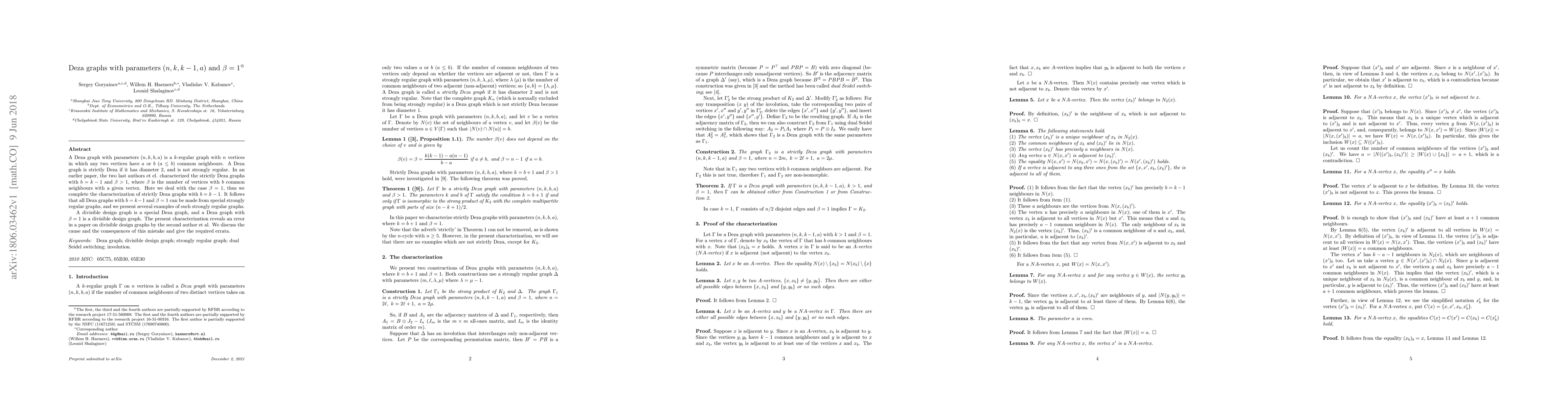 A Deza graph with parameters $(n,k,b,a)$ is a $k$-regular graph with $n$ vertices in which any two vertices have $a$ or $b$ ($a\leq b$) common neighbours. A Deza graph is strictly Deza if it has diameter $2$, and is not strongly regular. In an earlier paper, the two last authors et el. characterized the strictly Deza graphs with $b=k-1$ and $\beta > 1$, where $\beta$ is the number of vertices with $b$ common neighbours with a given vertex. Here we deal with the case $\beta=1$, thus we complete the characterization of strictly Deza graphs with $b=k-1$. It follows that all Deza graphs with $b=k-1$ and $\beta=1$ can be made from special strongly regular graphs, and we present several examples of such strongly regular graphs. A divisible design graph is a special Deza graph, and a Deza graph with $\beta=1$ is a divisible design graph. The present characterization reveals an error in a paper on divisible design graphs by the second author et al. We discuss the cause and the consequences of this mistake and give the required errata.