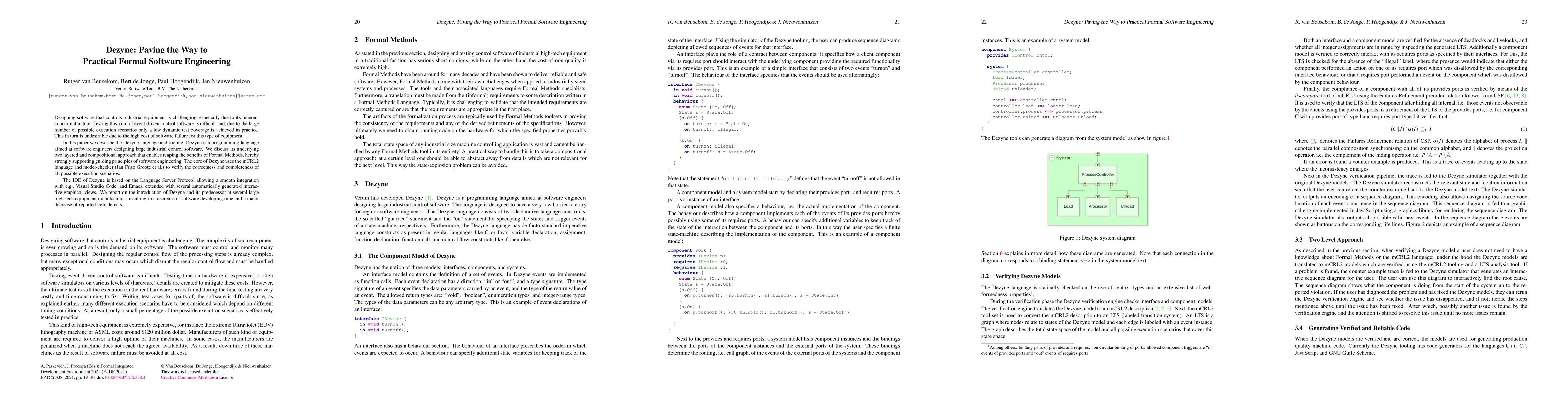 Designing software that controls industrial equipment is challenging, especially due to its inherent concurrent nature. Testing this kind of event driven control software is difficult and, due to the large number of possible execution scenarios only a low dynamic test coverage is achieved in practice. This in turn is undesirable due to the high cost of software failure for this type of equipment. In this paper we describe the Dezyne language and tooling; Dezyne is a programming language aimed at software engineers designing large industrial control software. We discuss its underlying two layered and compositional approach that enables reaping the benefits of Formal Methods, hereby strongly supporting guiding principles of software engineering. The core of Dezyne uses the mCRL2 language and model-checker (Jan Friso Groote et al.) to verify the correctness and completeness of all possible execution scenarios. The IDE of Dezyne is based on the Language Server Protocol allowing a smooth integration with e.g., Visual Studio Code, and Emacs, extended with several automatically generated interactive graphical views. We report on the introduction of Dezyne and its predecessor at several large high-tech equipment manufacturers resulting in a decrease of software developing time and a major decrease of reported field defects.