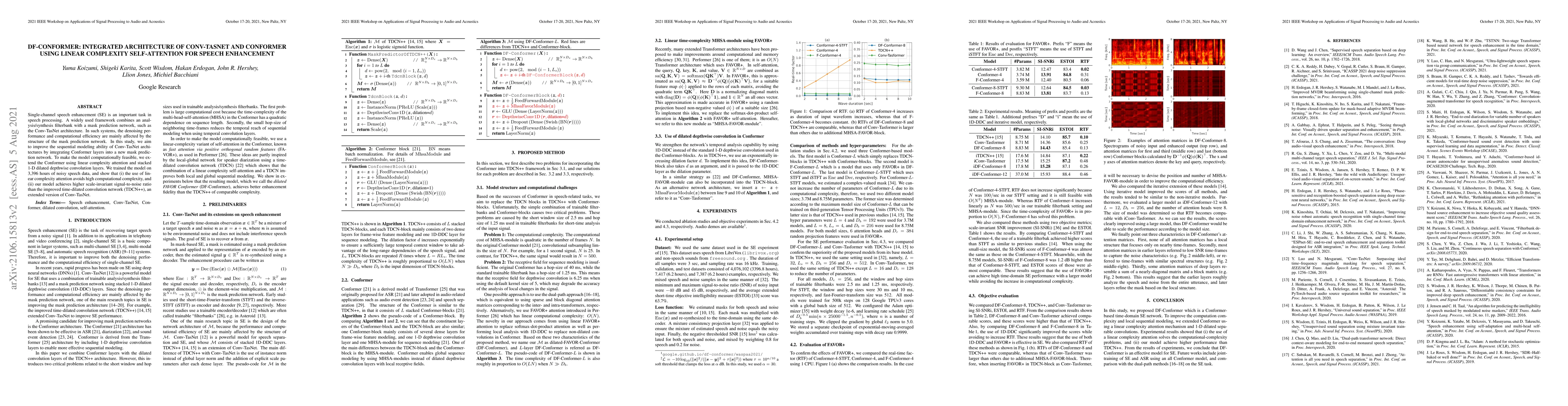 The DF-Conformer integrates Conv-TasNet and Conformer with linear complexity self-attention for enhanced speech enhancement, achieving better denoising performance and computational efficiency compared to TDCN++.