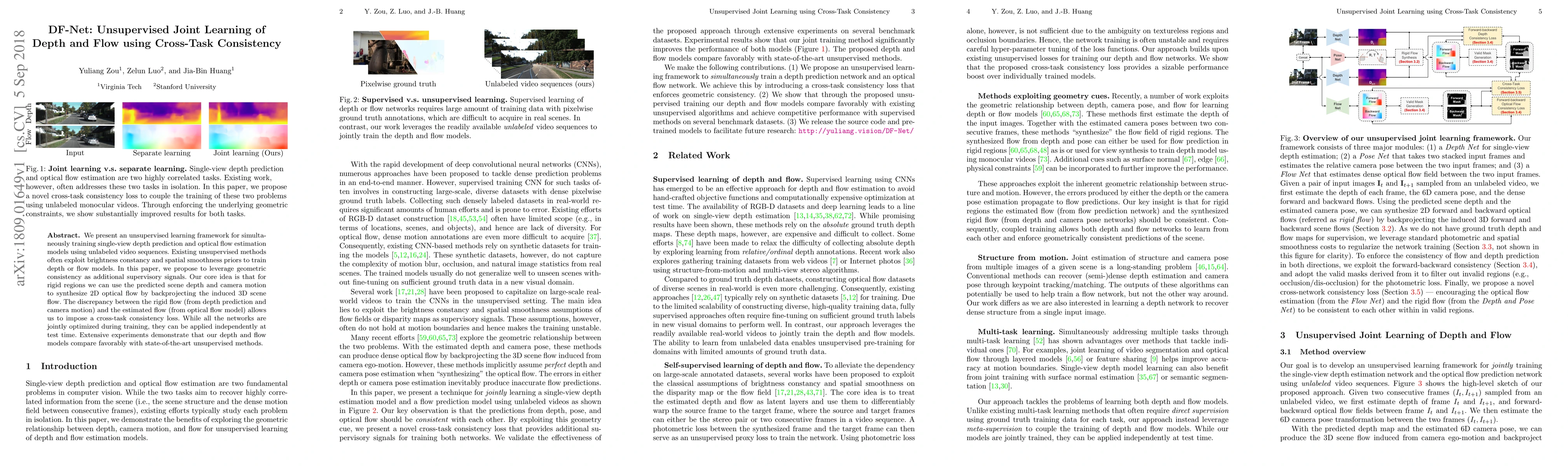 The DF-Net framework proposes an unsupervised learning method for jointly training depth prediction and optical flow models using unlabeled video sequences, leveraging geometric consistency to synthesize and compare 2D optical flow, thereby achieving state-of-the-art performance compared to existing methods. The networks are jointly optimized but can be independently applied during inference.