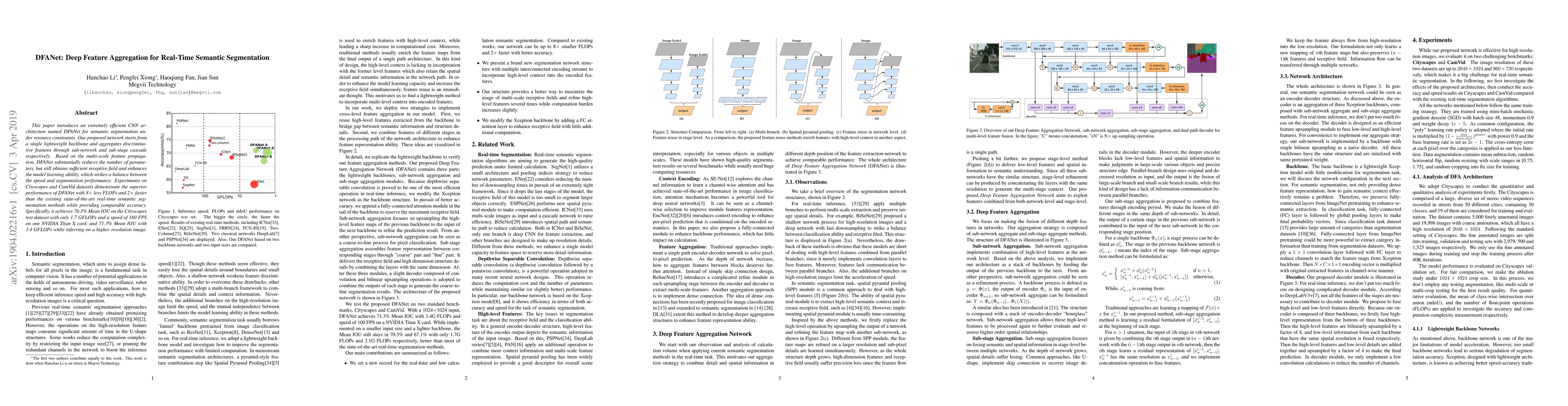 DFANet is a highly efficient CNN architecture designed for real-time semantic segmentation under resource constraints, utilizing a lightweight backbone and feature aggregation techniques to achieve a balance between speed and performance. It demonstrates superior results on Cityscapes and CamVid datasets, achieving 8× fewer FLOPs and 2× faster speed compared to existing methods while maintaining comparable accuracy.