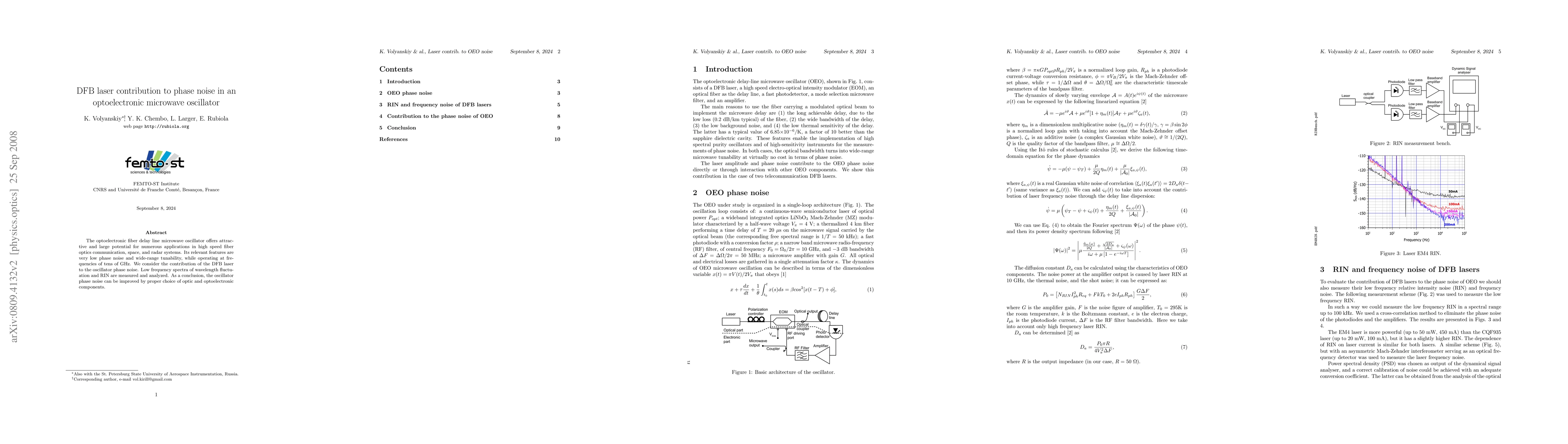 The optoelectronic fiber delay line microwave oscillator offers attractive and large potential for numerous applications in high speed fiber optics communication, space, and radar systems. Its relevant features are very low phase noise and wide-range tunability, while operating at frequencies of tens of GHz. We consider the contribution of the DFB laser to the oscillator phase noise. Low frequency spectra of wavelength fluctuation and RIN are measured and analyzed. As a conclusion, the oscillator phase noise can be improved by proper choice of optic and optoelectronic components.