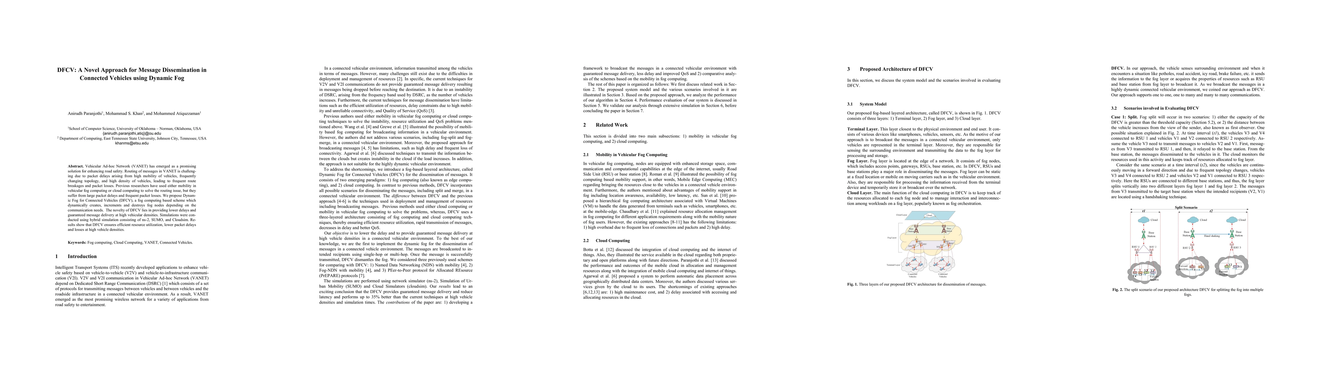 Title: DFCV: A Novel Approach for Message Dissemination in Connected Vehicles using Dynamic Fog Summary: This paper proposes DFCV, a fog computing-based method for routing messages in VANETs, which dynamically adjusts fog nodes to optimize resource utilization, reduce packet delays, and ensure reliable message delivery despite high vehicle mobility and density. Simulation results demonstrate its effectiveness over existing methods.