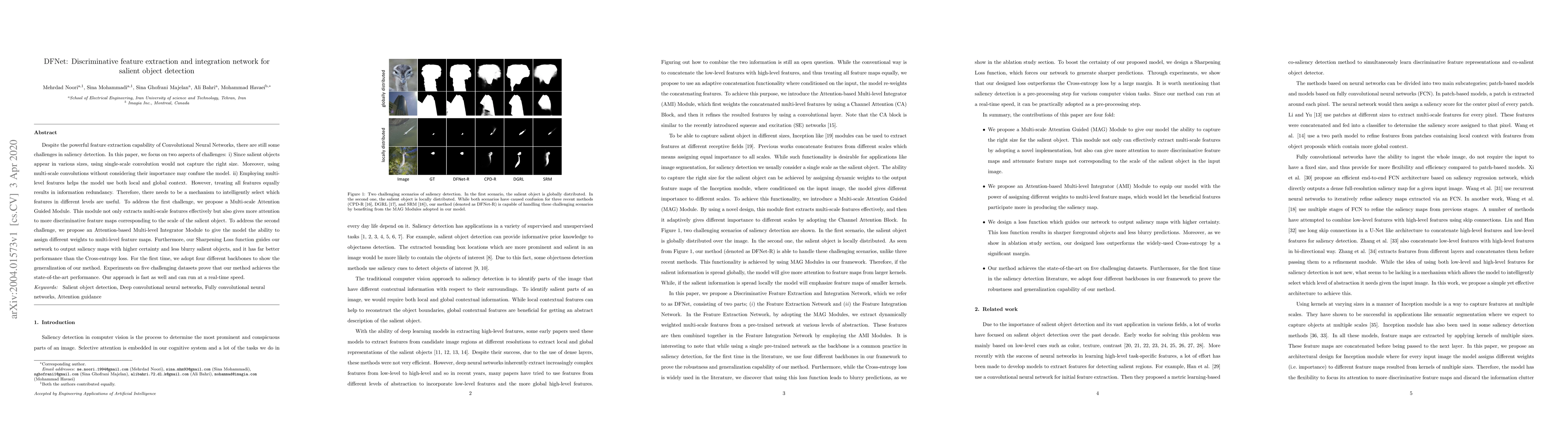 A new saliency detection method, DFNet, uses attention mechanisms to selectively integrate multi-scale features from different levels, achieving state-of-the-art performance on five challenging datasets.