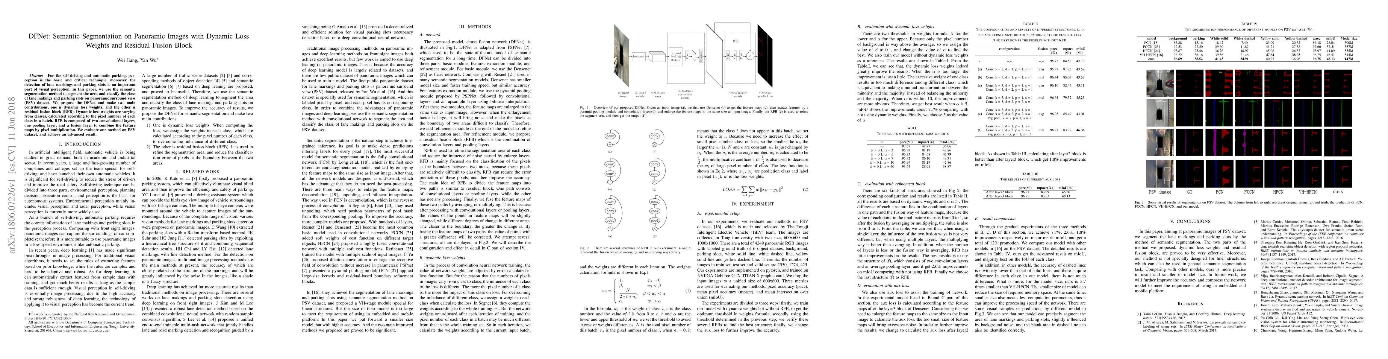 DFNet introduces a novel semantic segmentation method for panoramic images, employing dynamic loss weights and a residual fusion block to enhance lane marking and parking slot detection. The dynamic loss weights adapt based on class pixel distribution, while the RFB combines feature maps for improved classification.