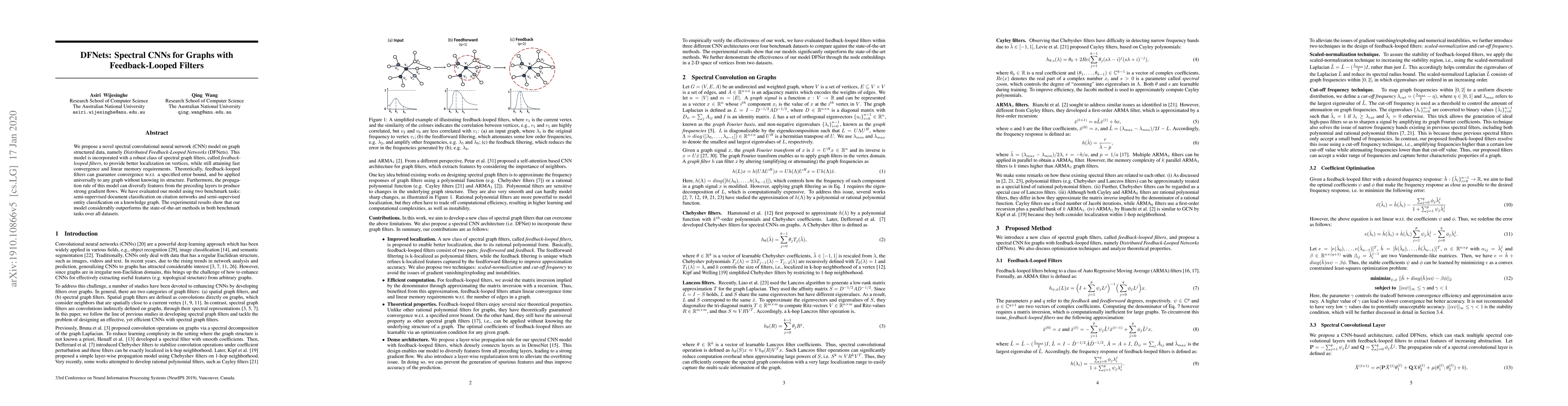 The paper introduces DFNets, a spectral CNN model for graph data, utilizing feedback-looped filters for improved vertex localization and fast convergence. Experimental results demonstrate superior performance over state-of-the-art methods in semi-supervised classification tasks on citation networks and knowledge graphs.