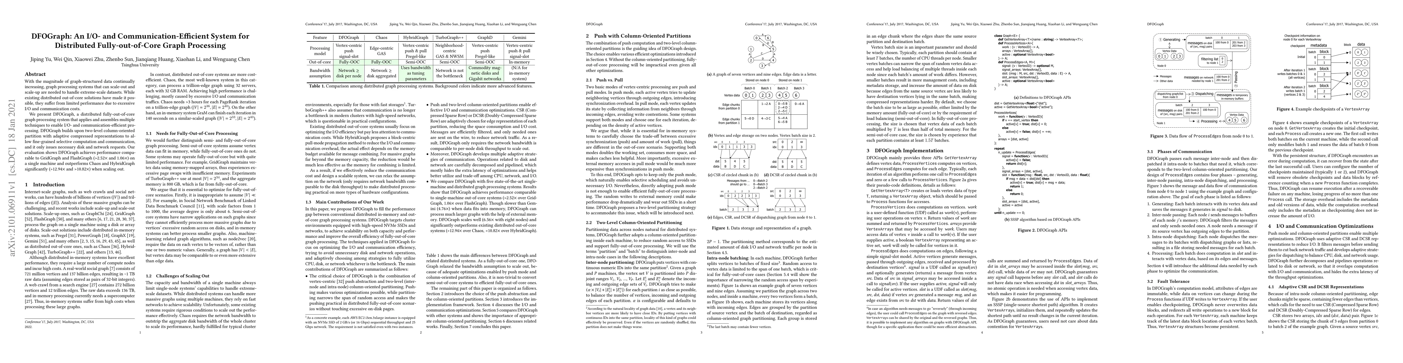 DFOGraph is a distributed system for fully-out-of-core graph processing that minimizes I/O and communication costs through adaptive compressed representations and selective computation. It outperforms existing solutions in both single-machine and distributed settings.