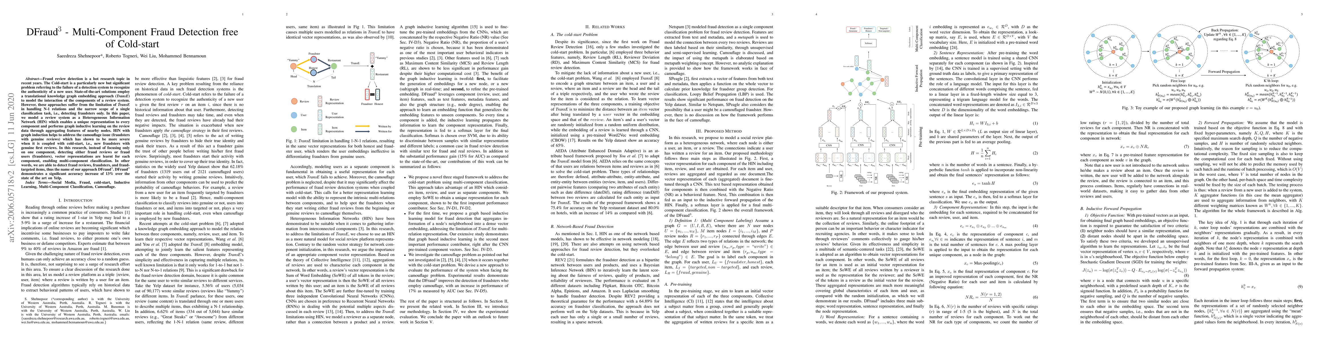 Fraud review detection is a hot research topic inrecent years. The Cold-start is a particularly new but significant problem referring to the failure of a detection system to recognize the authenticity of a new user. State-of-the-art solutions employ a translational knowledge graph embedding approach (TransE) to model the interaction of the components of a review system. However, these approaches suffer from the limitation of TransEin handling N-1 relations and the narrow scope of a single classification task, i.e., detecting fraudsters only. In this paper, we model a review system as a Heterogeneous InformationNetwork (HIN) which enables a unique representation to every component and performs graph inductive learning on the review data through aggregating features of nearby nodes. HIN with graph induction helps to address the camouflage issue (fraudsterswith genuine reviews) which has shown to be more severe when it is coupled with cold-start, i.e., new fraudsters with genuine first reviews. In this research, instead of focusing only on one component, detecting either fraud reviews or fraud users (fraudsters), vector representations are learnt for each component, enabling multi-component classification. In other words, we are able to detect fraud reviews, fraudsters, and fraud-targeted items, thus the name of our approach DFraud3. DFraud3 demonstrates a significant accuracy increase of 13% over the state of the art on Yelp.