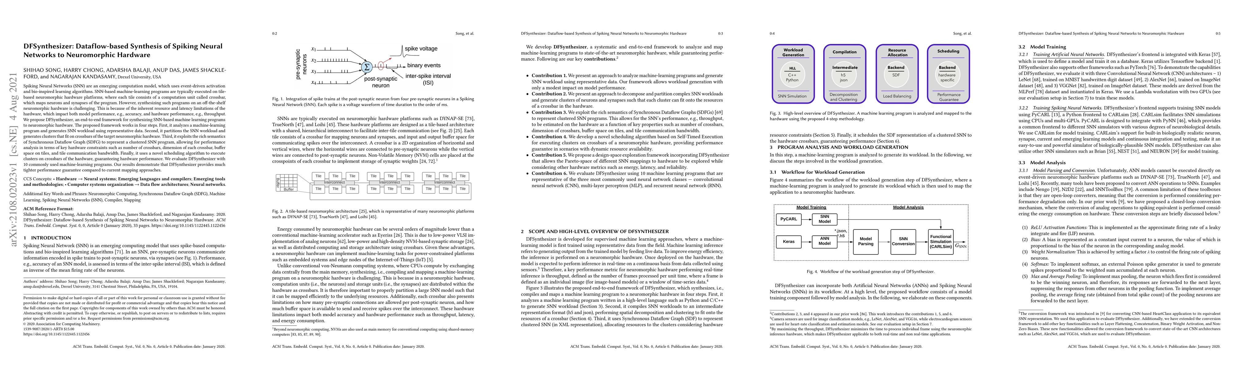 DFSynthesizer is a framework for synthesizing Spiking Neural Networks (SNN) to neuromorphic hardware, addressing challenges in resource and latency limitations. It partitions SNN workloads, represents them using Synchronous Dataflow Graphs, and employs a scheduling algorithm to optimize performance, achieving tighter guarantees compared to existing methods.