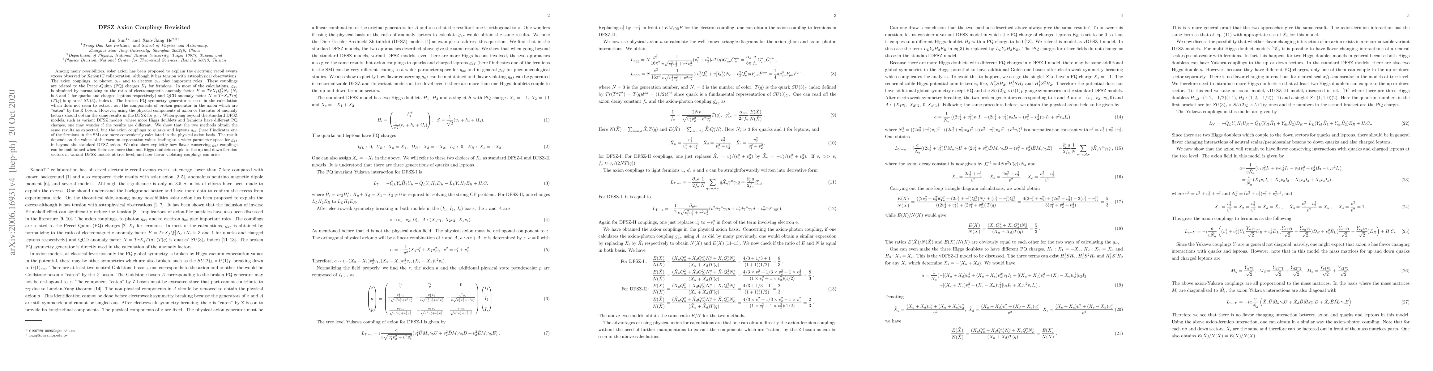 Among many possibilities, solar axion has been proposed to explain the electronic recoil events excess observed by Xenon1T collaboration, although it has tension with astrophysical observations. The axion couplings, to photon $g_{a\gamma}$ and to electron $g_{ae}$ play important roles. These couplings are related to the Peccei-Quinn (PQ) charges $X_f$ for fermions. In most of the calculations, $g_{a\gamma}$ is obtained by normalizing to the ratio of electromagnetic anomaly factor $E = TrX_f Q^2_f N_c$ ($N_c$ is 3 and 1 for quarks and charged leptons respectively) and QCD anomaly factor $N = TrX_q T(q)$ ($T(q)$ is quarks' $SU(3)_c$ index). The broken PQ symmetry generator is used in the calculation which does not seem to extract out the components of broken generator in the axion which are "eaten" by the $Z$ boson. However, using the physical components of axion or the ratio of anomaly factors should obtain the same results in the DFSZ for $g_{a\gamma}$. When going beyond the standard DFSZ models, such as variant DFSZ models, where more Higgs doublets and fermions have different PQ charges, one may wonder if the results are different. We show that the two methods obtain the same results as expected, but the axion couplings to quarks and leptons $g_{af}$ (here f indicates one of the fermions in the SM) are more conveniently calculated in the physical axion basis. The result depends on the values of the vacuum expectation values leading to a wider parameter space for $g_{af}$ in beyond the standard DFSZ axion. We also show explicitly how flavor conserving $g_{af}$ couplings can be maintained when there are more than one Higgs doublets couple to the up and down fermion sectors in variant DFSZ models at tree level, and how flavor violating couplings can arise.