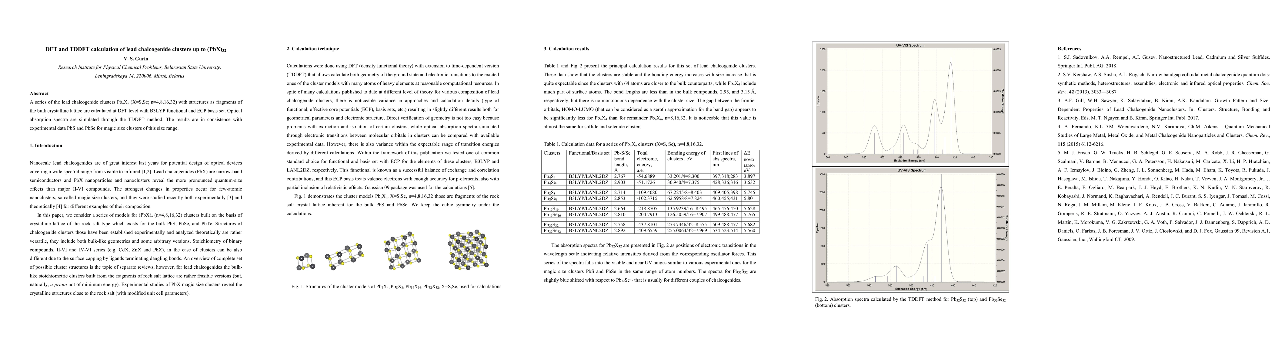 The paper calculates lead chalcogenide clusters using DFT and simulates their optical absorption spectra using TDDFT, yielding results consistent with experimental data for certain cluster sizes.