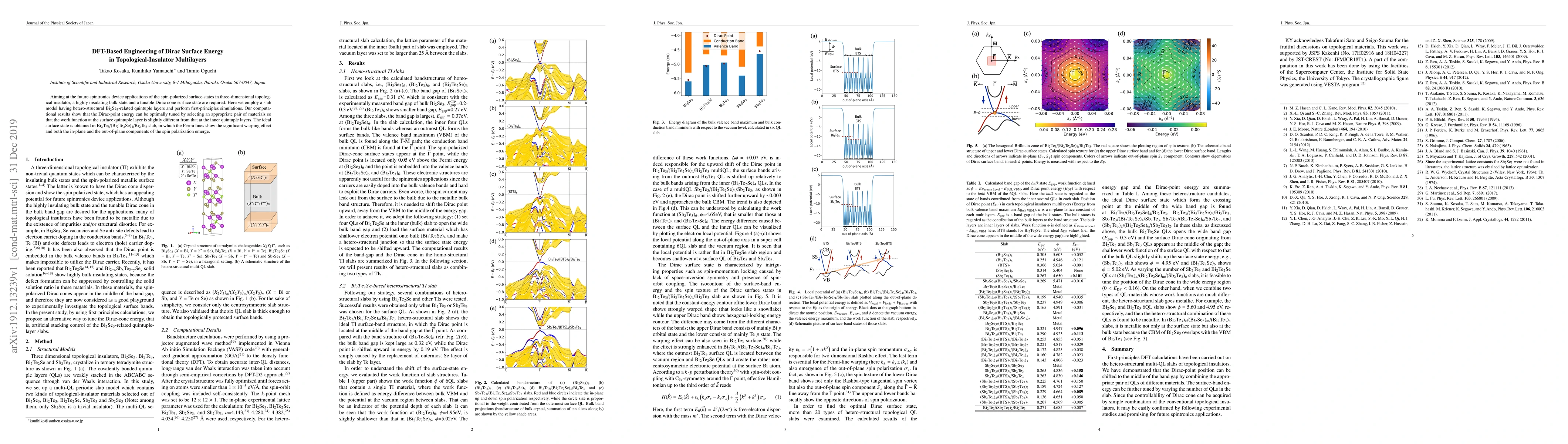 Aiming at the future spintronics device applications of the spin-polarized surface states in three-dimensional topological insulator, a highly insulating bulk state and a tunable Dirac cone surface state are required. Here we employ a slab model having hetero-structural Bi2Se3-related quintuple layers and perform first-principles simulations. Our computational results show that the Dirac-point energy can be optimally tuned by selecting an appropriate pair of materials so that the work function at the surface quintuple layer is slightly different from that at the inner quintuple layers. The ideal surface state is obtained in Bi2Te3/(Bi2Te2Se)4/Bi2Te3 slab, in which the Fermi lines show the significant warping effect and both the in-plane and the out-of-plane components of the spin polarization emerge.