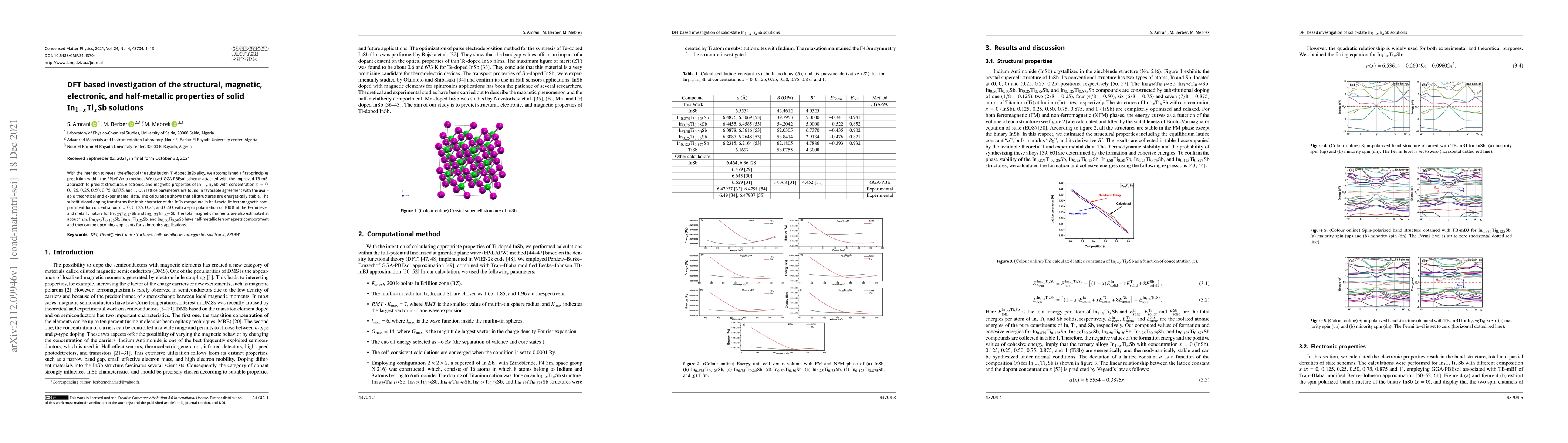 With the intention to reveal the effect of the substitution, Ti-doped InSb alloy, we accomplished a first-principles prediction within the FPLAPW+lo method. We used GGA-PBEsol scheme attached with the improved TB-mBJ approach to predict structural, electronic, and magnetic properties of In$_{1-x}$Ti$_{x}$Sb with concentration $x = 0$, $0.125$, $0.25$, $0.50$, $0.75$, $0.875$, and $1$. Our lattice parameters are found in favorable agreement with the available theoretical and experimental data. The calculation shows that all structures are energetically stable. The substitutional doping transforms the ionic character of the InSb compound in half-metallic ferromagnetic comportment for concentration $x = 0$, $0.125$, $0.25$, and $0.50$, with a spin polarization of $100$% at the Fermi level, and metallic nature for In$_{0.25}$Ti$_{0.75}$Sb and In$_{0.125}$Ti$_{0.875}$Sb. The total magnetic moments are also estimated at about 1 $\mu_{\text{B}}$. In$_{0.875}$Ti$_{0.125}$Sb, In$_{0.75}$Ti$_{0.25}$Sb, and In$_{0.50}$Ti$_{0.50}$Sb have half-metallic ferromagnets comportment and they can be upcoming applicants for spintronics applications.