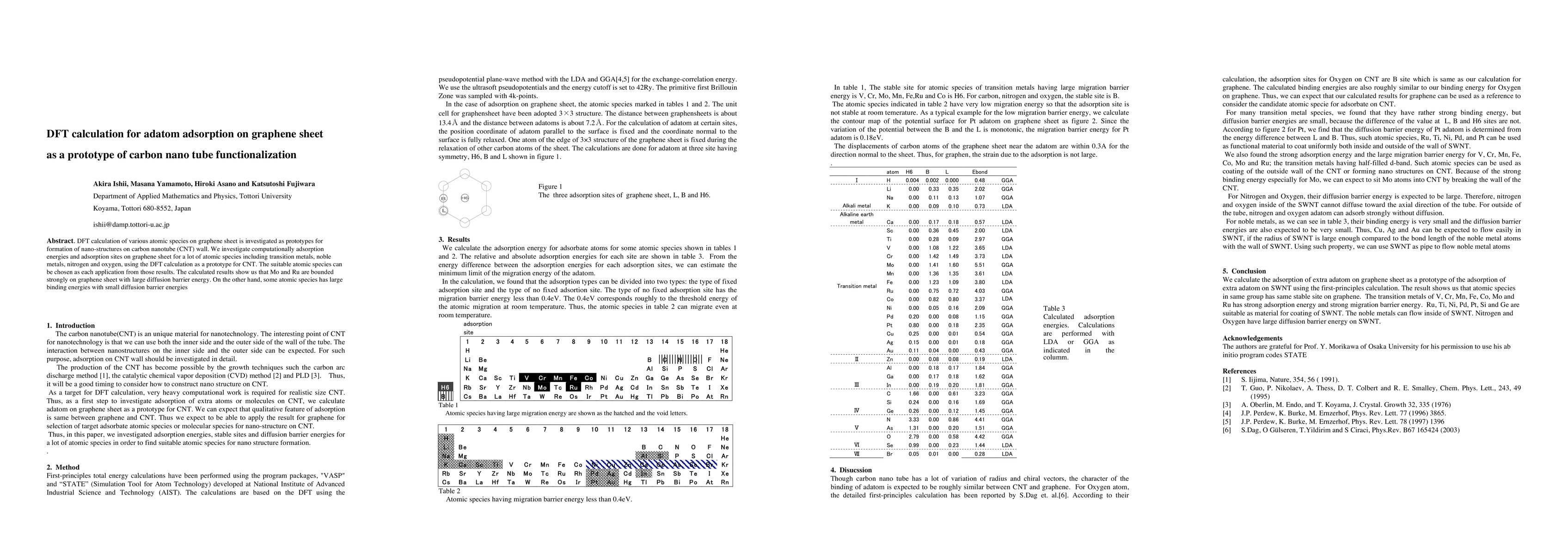 First-principles total energy calculations using VASP and STATE, based on DFT with LDA and GGA for exchange-correlation energy. Ultrasoft pseudopotentials with energy cutoff of 42Ry and 4k-points for Brillouin Zone sampling. Adatom adsorption on graphene sheet with 3x3 unit cell structure, distance between sheets ~13.4Å, and between adatoms ~7.2Å. Relaxation of adatom position normal to surface, with one edge atom fixed during relaxation.