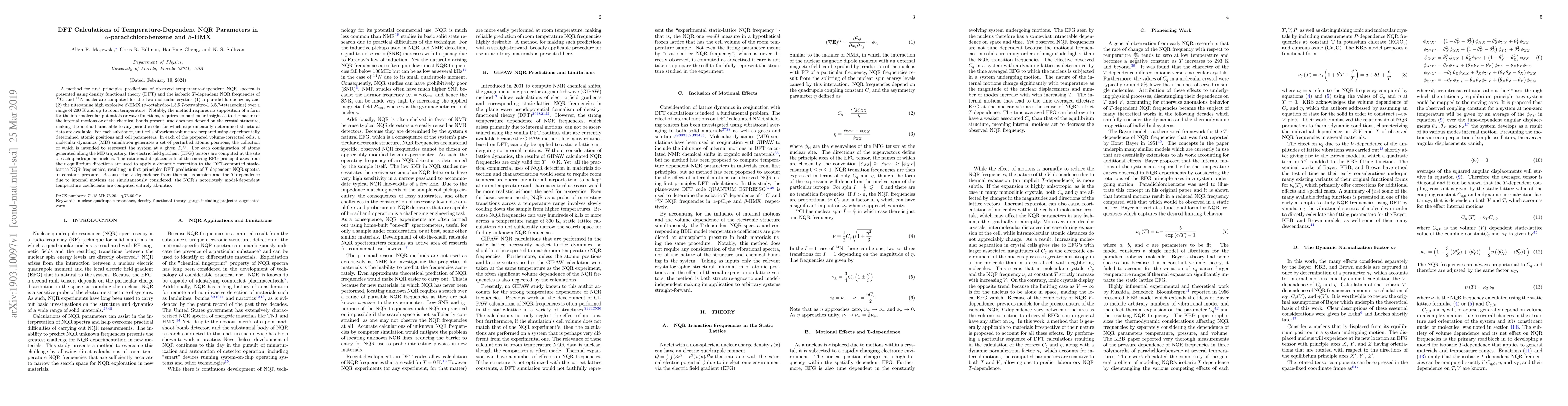 This study employs density functional theory (DFT) to predict temperature-dependent nuclear quadrupole resonance (NQR) spectra for α-paradichlorobenzene and β-HMX, without assuming specific intermolecular potentials or wave functions. The method accounts for thermal expansion and internal motions through molecular dynamics simulations, yielding ab-initio NQR frequency calculations.
