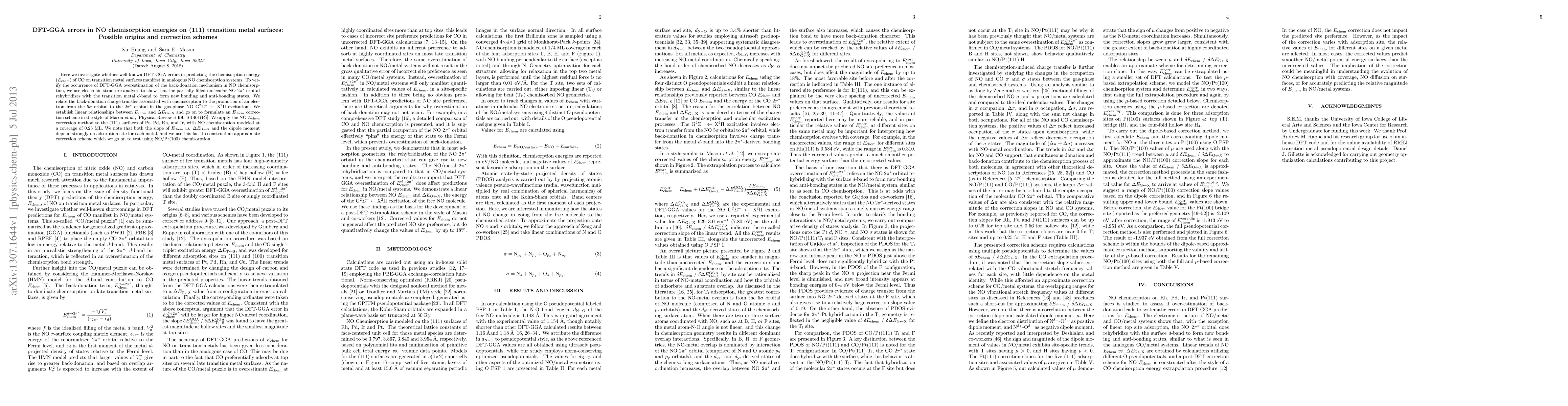 This paper investigates DFT-GGA errors in predicting NO chemisorption energies on transition metal surfaces, finding that DFT-GGA overestimates back-donation due to rehybridization of the NO 2$\pi^{*}$ orbital with the metal d-band. A correction scheme is formulated based on the linear relationship between chemisorption energy and gas-phase NO excitation energy, and tested on Pt, Pd, Rh, and Ir surfaces.