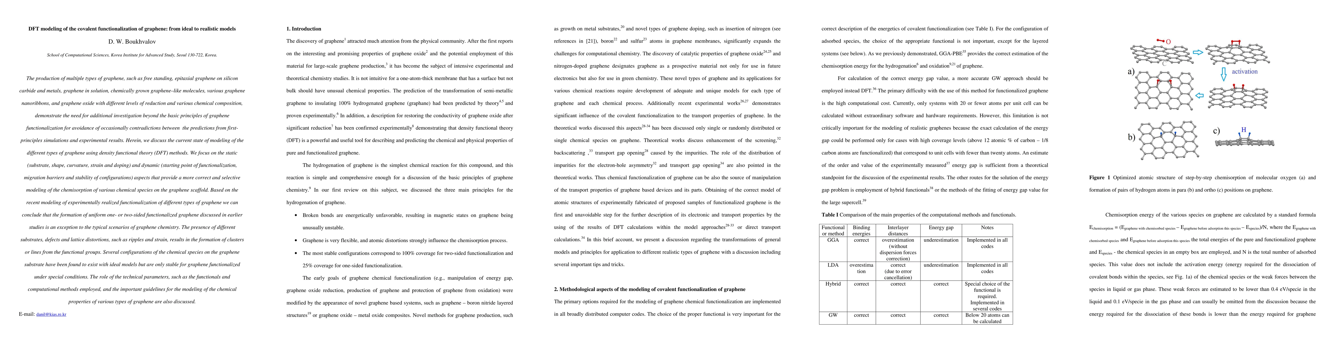 This paper discusses the use of density functional theory (DFT) to model covalent functionalization of various types of graphene, highlighting the discrepancies between ideal and realistic models and emphasizing the importance of substrate effects and functionalization conditions for accurate simulations. It concludes that uniform functionalization is rare, with most functional groups forming clusters or lines due to substrate and lattice effects.