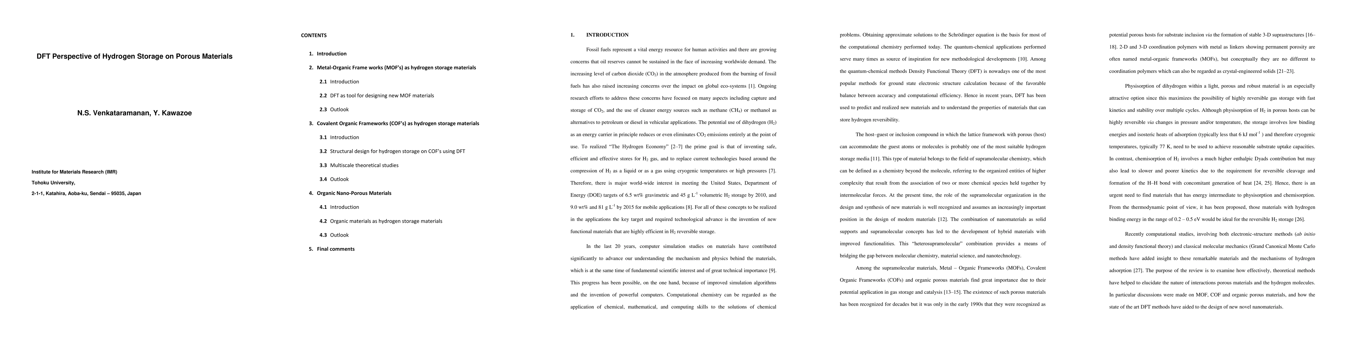 This paper reviews the use of Density Functional Theory (DFT) to study hydrogen storage in various porous materials, focusing on physisorption at cryogenic temperatures. The paper highlights the enhancement of adsorption energies through doping with light metals and employs computational methods to design materials for near-room temperature hydrogen storage.