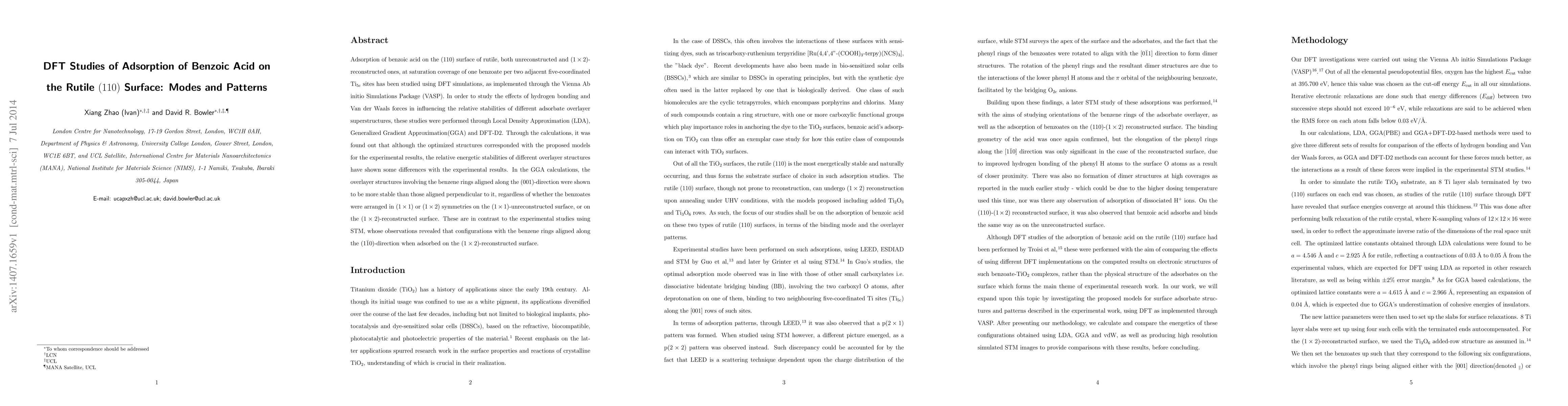 DFT simulations of benzoic acid adsorption on rutile (110) surface show varying stabilities depending on the method used, with GGA calculations favoring structures aligned along the (001)-direction over those perpendicular to it.