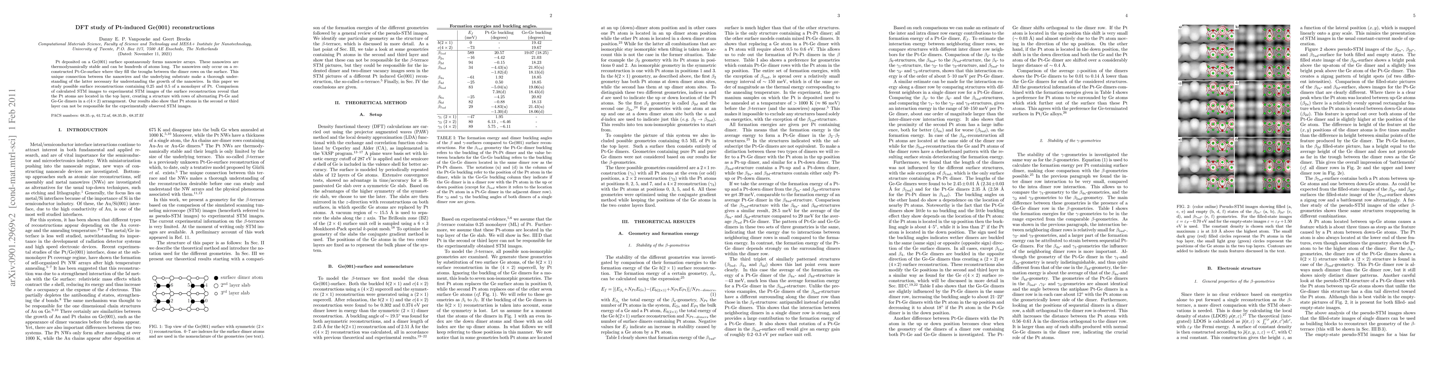 This study uses DFT to analyze Pt-induced surface reconstructions on Ge(001), finding that Pt atoms form nanowire arrays in a c(4x2) arrangement with alternating Pt-Ge and Ge-Ge dimers, explaining the stability and formation of these nanowires. The research concludes that Pt atoms in deeper layers do not correspond to observed STM images.