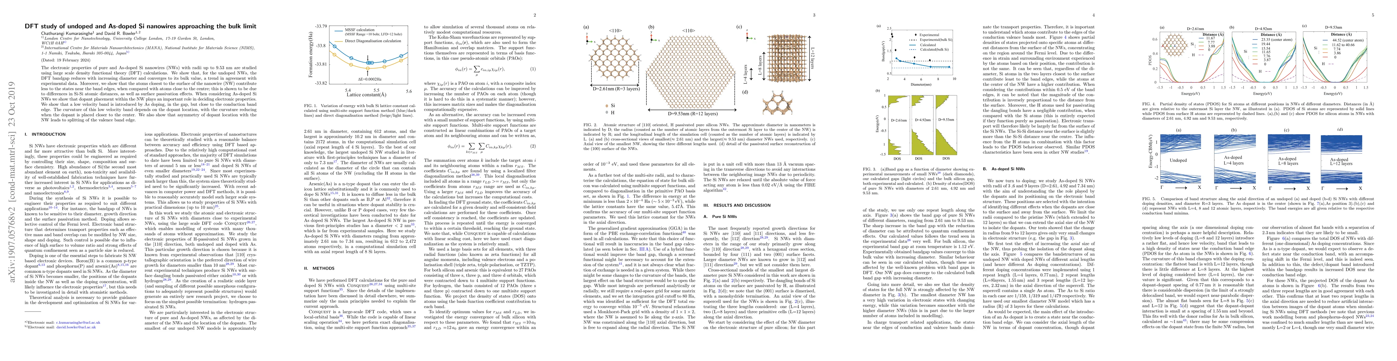 The electronic properties of pure and As-doped Si nanowires with radii up to 9.53 nm are studied using large scale density functional theory (DFT) calculations. We show that, for the undoped nanowires, the DFT bandgap reduces with increasing diameter and converges to its bulk value, a trend in agreement with experimental data. Moreover, we show that the atoms closest to the surface of the nanowire contribute less to the states near the band edges, when compared with atoms close to the centre; this is shown to be due to differences in Si-Si atomic distances, as well as surface passivation effects. When considering As-doped Si nanowires we show that dopant placement within the nanowire plays an important role in deciding electronic properties. We show that a low velocity band is introduced by As doping, in the gap, but close to the conduction band edge. The dopant location affects the curvature of this band, with the curvature reducing when the dopant is placed closer to the center. We also show that asymmetry of dopant location with the nanowire leads to splitting of the valence band edge.