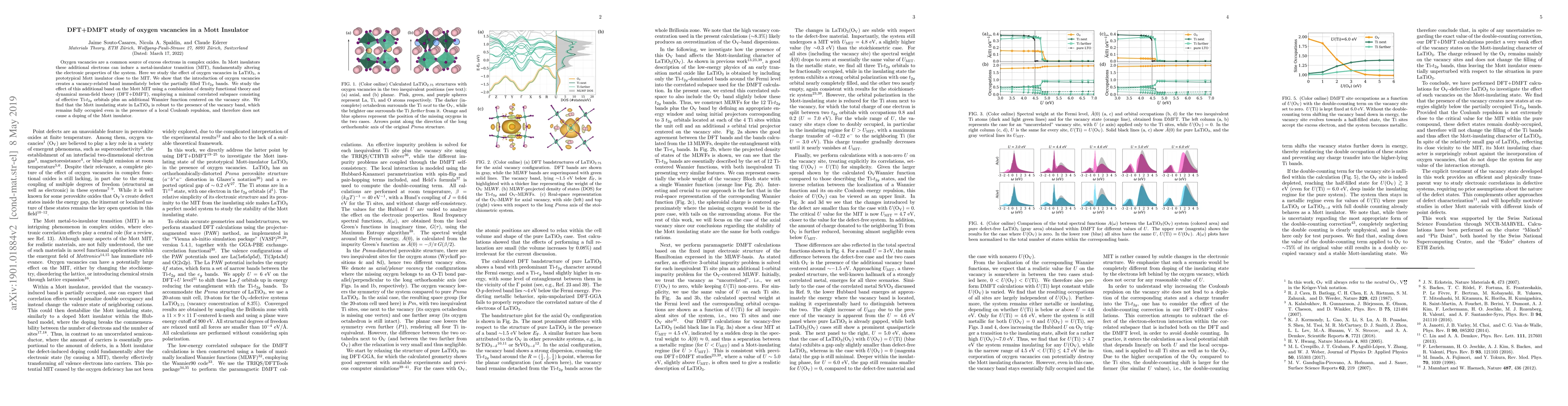 The study employs DFT+DMFT to investigate oxygen vacancies in the Mott insulator LaTiO3, revealing that vacancies induce a vacancy-related band below Ti-t2g bands but do not disrupt the Mott insulating state, which remains robust even with local Coulomb repulsion.