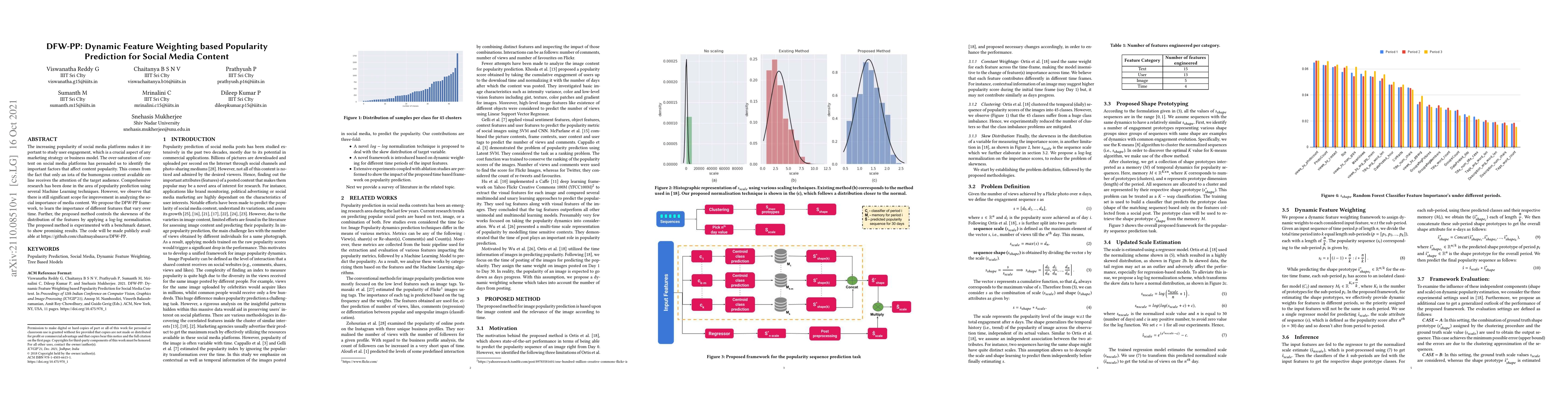 The increasing popularity of social media platforms makes it important to study user engagement, which is a crucial aspect of any marketing strategy or business model. The over-saturation of content on social media platforms has persuaded us to identify the important factors that affect content popularity. This comes from the fact that only an iota of the humongous content available online receives the attention of the target audience. Comprehensive research has been done in the area of popularity prediction using several Machine Learning techniques. However, we observe that there is still significant scope for improvement in analyzing the social importance of media content. We propose the DFW-PP framework, to learn the importance of different features that vary over time. Further, the proposed method controls the skewness of the distribution of the features by applying a log-log normalization. The proposed method is experimented with a benchmark dataset, to show promising results. The code will be made publicly available at https://github.com/chaitnayabasava/DFW-PP.