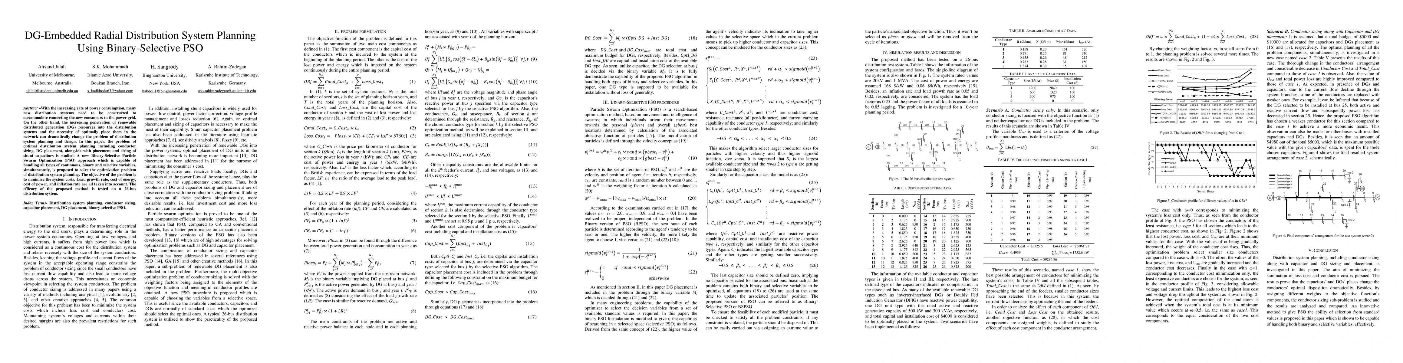 This paper proposes a new Binary-Selective Particle Swarm Optimization (PSO) method for optimal planning of radial distribution systems, addressing conductor sizing, DG placement, and shunt capacitors. The method is tested on a 26-bus system to minimize system costs considering load growth, energy, power costs, and inflation.