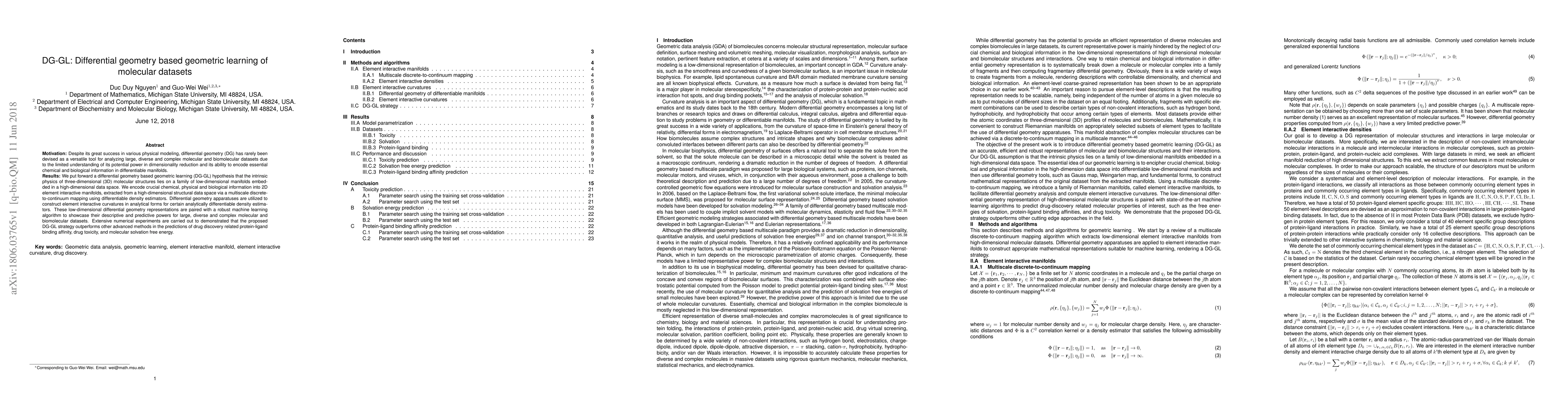 Motivation: Despite its great success in various physical modeling, differential geometry (DG) has rarely been devised as a versatile tool for analyzing large, diverse and complex molecular and biomolecular datasets due to the limited understanding of its potential power in dimensionality reduction and its ability to encode essential chemical and biological information in differentiable manifolds. Results: We put forward a differential geometry based geometric learning (DG-GL) hypothesis that the intrinsic physics of three-dimensional (3D) molecular structures lies on a family of low-dimensional manifolds embedded in a high-dimensional data space. We encode crucial chemical, physical and biological information into 2D element interactive manifolds, extracted from a high-dimensional structural data space via a multiscale discrete-to-continuum mapping using differentiable density estimators. Differential geometry apparatuses are utilized to construct element interactive curvatures %Gaussian curvature, mean curvature, minimum curvature and maximum curvature in analytical forms for certain analytically differentiable density estimators. These low-dimensional differential geometry representations are paired with a robust machine learning algorithm to showcase their descriptive and predictive powers for large, diverse and complex molecular and biomolecular datasets. Extensive numerical experiments are carried out to demonstrated that the proposed DG-GL strategy outperforms other advanced methods in the predictions of drug discovery related protein-ligand binding affinity, drug toxicity, and molecular solvation free energy.