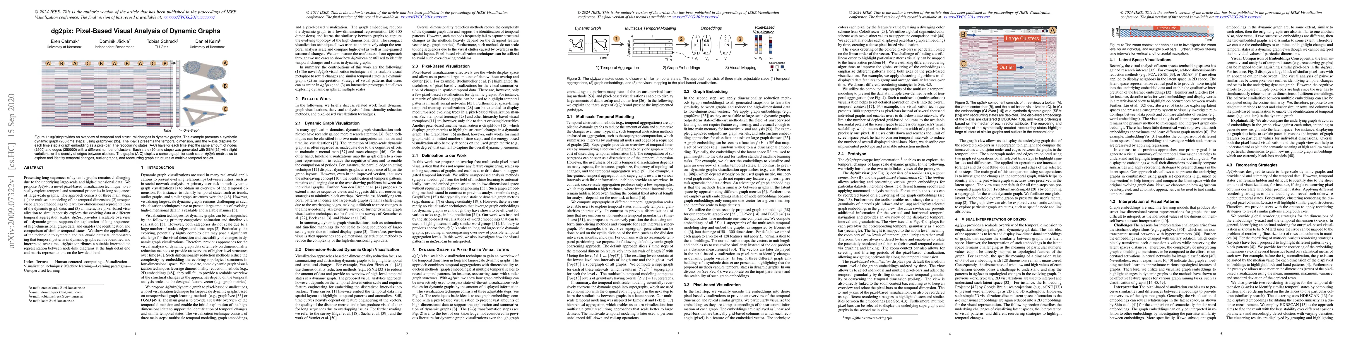 dg2pix is a novel pixel-based visualization technique for exploring large-scale dynamic graphs by modeling temporal dimensions, embedding graph data, and providing interactive visualizations. It enables scalable overviews and identification of temporal patterns in long sequences of high-dimensional graph data.