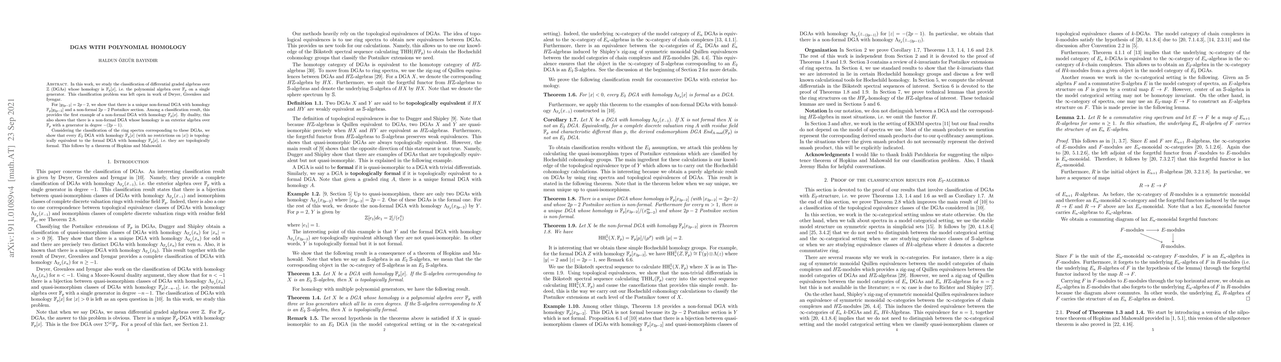 In this work, we study the classification of differential graded algebras over $\mathbb{Z}$ (DGAs) whose homology is $\mathbb{F}_p[x]$, i.e. the polynomial algebra over $\mathbb{F}_p$ on a single generator. This classification problem was left open in work of Dwyer, Greenlees and Iyengar. For $\lvert y_{2p-2} \rvert = 2p-2$, we show that there is a unique non-formal DGA with homology $\mathbb{F}_p[y_{2p-2}]$ and a non-formal $2p-2$ Postnikov section. Among a classification result, this provides the first example of a non-formal DGA with homology $\mathbb{F}_p[x]$. By duality, this also shows that there is a non-formal DGA whose homology is an exterior algebra over $\mathbb{F}_p$ with a generator in degree $-(2p-1)$. Considering the classification of the ring spectra corresponding to these DGAs, we show that every $E_2$ DGA with homology $\mathbb{F}_p[x]$ (with no restrictions on $\lvert x \rvert$) is topologically equivalent to the formal DGA with homology $\mathbb{F}_p[x]$, i.e. they are topologically formal. This follows by a theorem of Hopkins and Mahowald.
